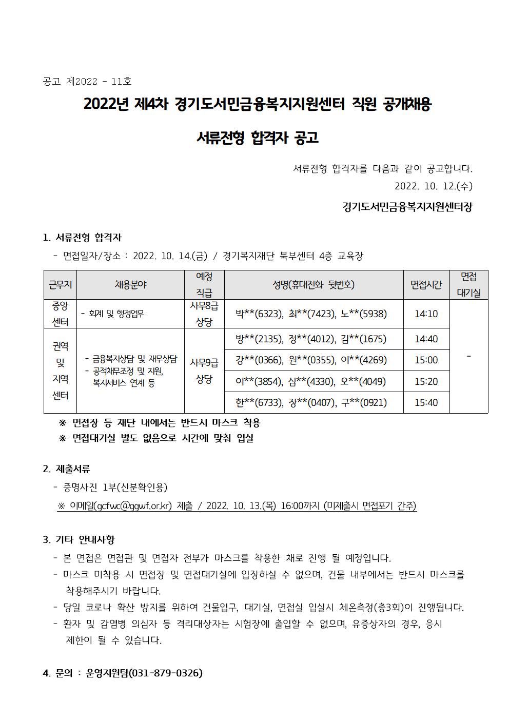 2022 제4차 인사채용 서류심사 합격자 공고문(서민금융복지지원센터)