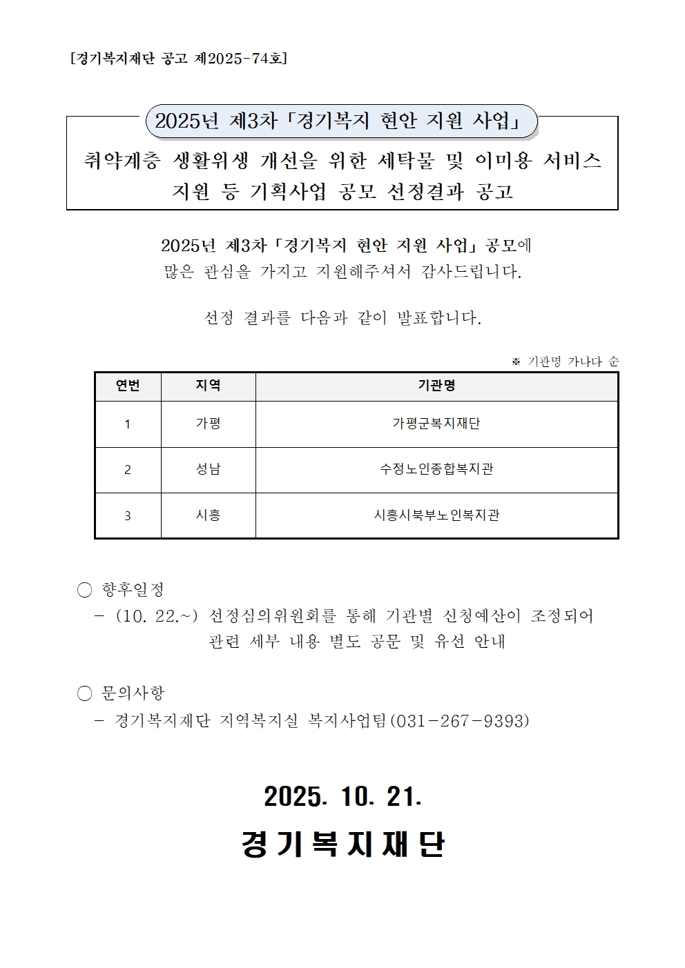 [경기복지재단 공고 제2025-74호] 2025년 제3차 경기복지 현안 지원 사업(취약계층 생활위생 개선을 위한 세탁물 및 이미용 서비스 지원 등 기획사업) 공모 선정결과 공고
