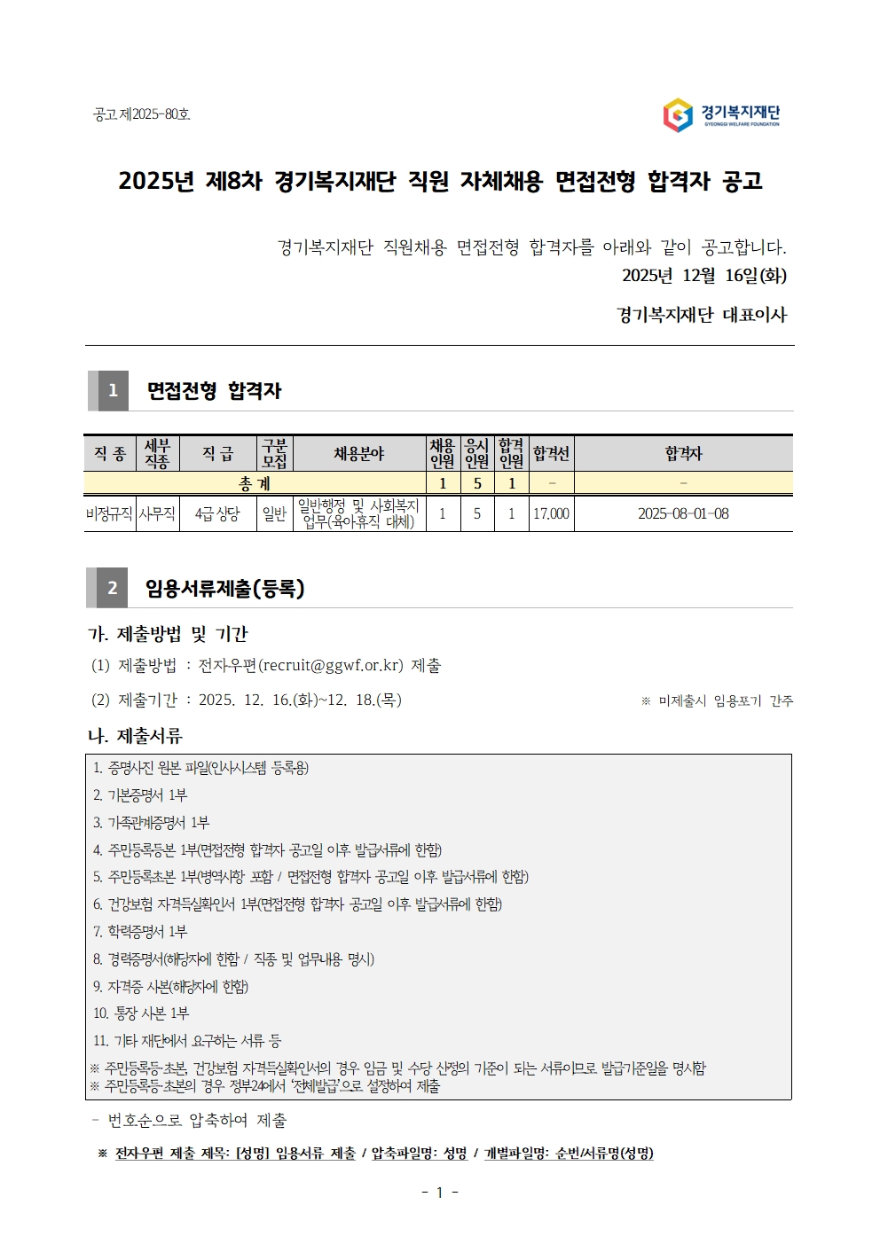 [공고 제2025-80호] 2025년 제8차 경기복지재단 직원 자체채용 면접전형 합격자 공고