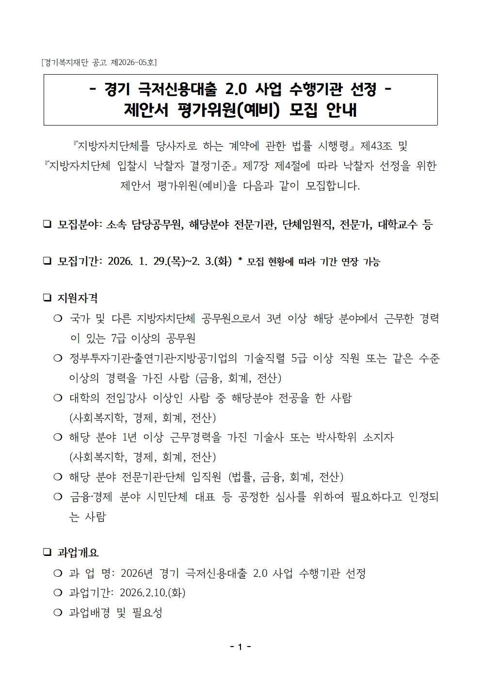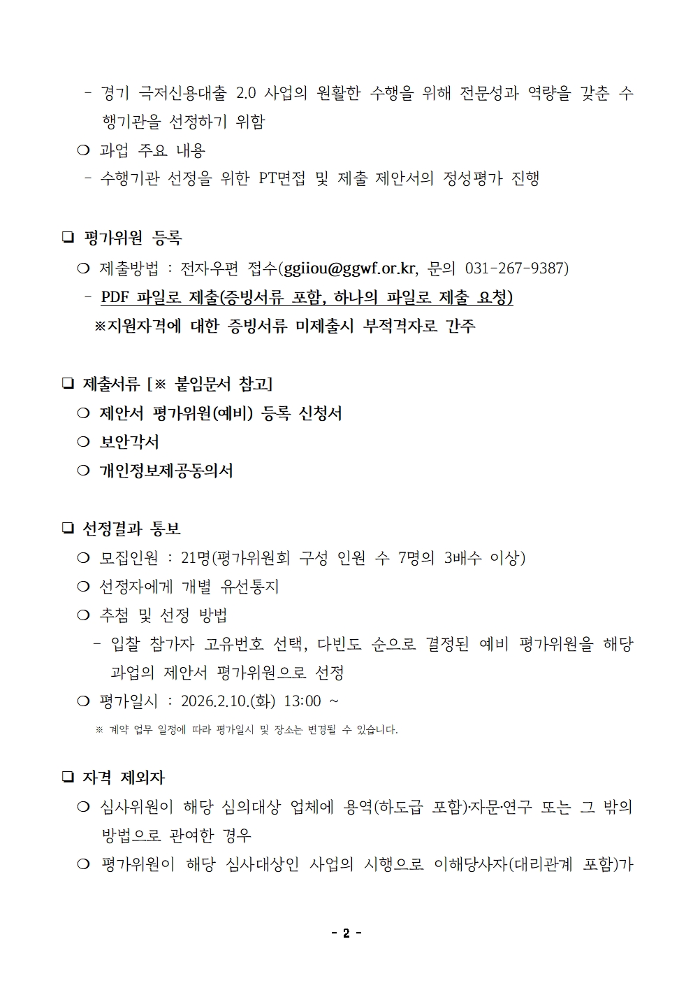 경기 극저신용대출2.0 사업 수행기관 선정 제안서 평가위원(예비) 모집 공고