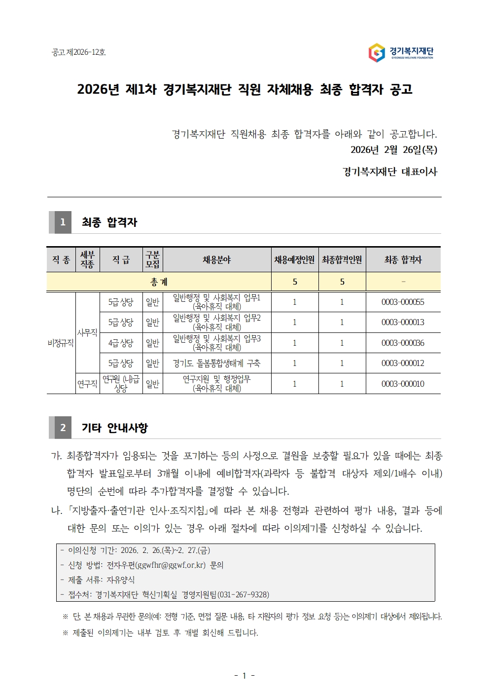 [공고 제2025-12호] 2026년 제1차 경기복지재단 직원 자체채용 최종 합격자 공고