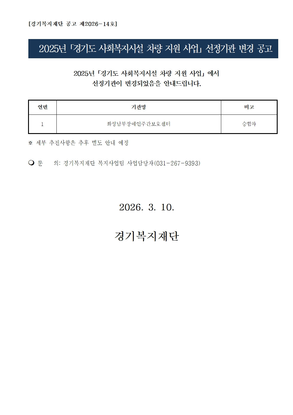 [경기복지재단 공고 제2026-14호] 2025년 경기도 사회복지시설 차량 지원 사업 선정기관 변경 공고