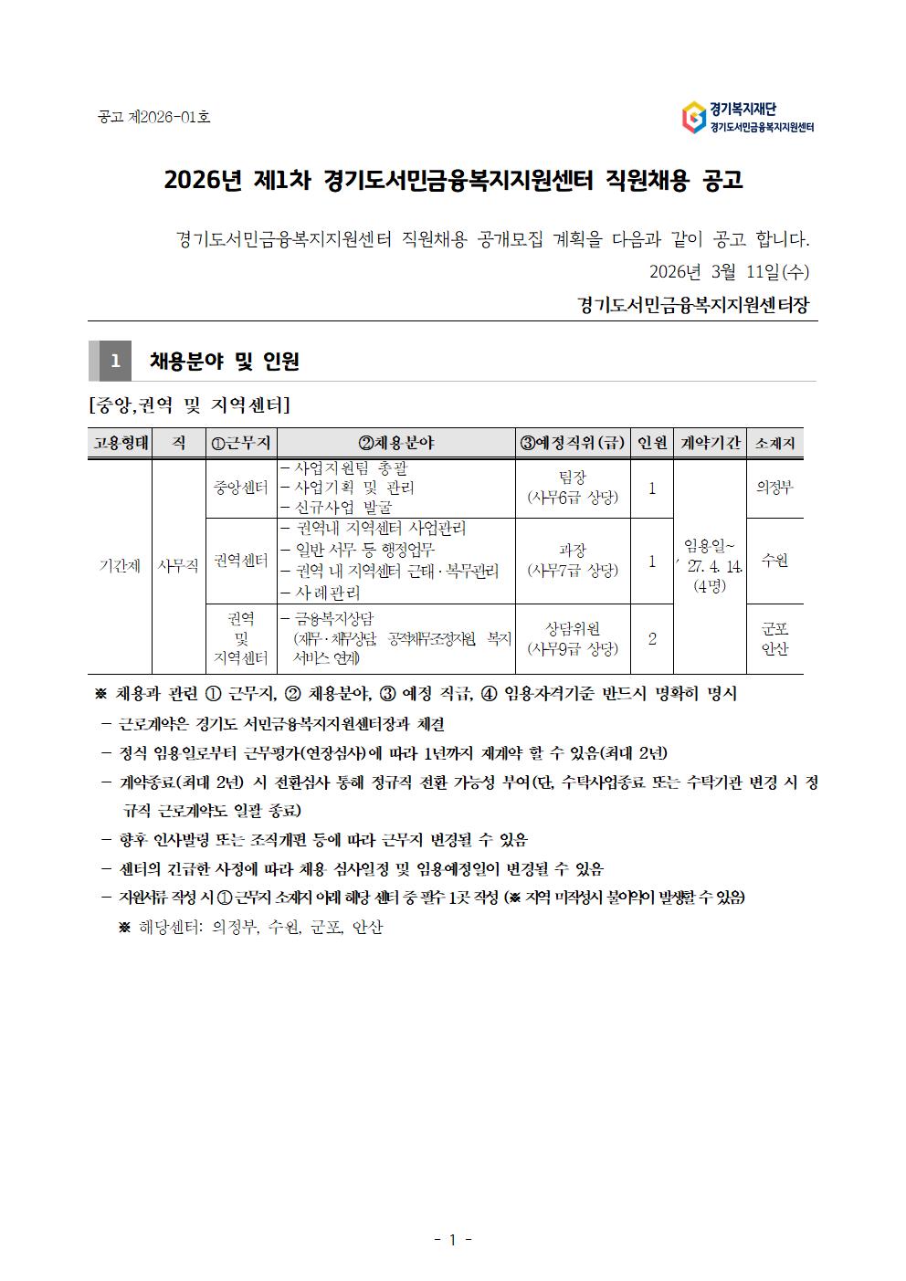 [경기도서민금융복지지원센터]2026년 제1차 경기도서민금융복지지원센터 직원 공개채용 공고
