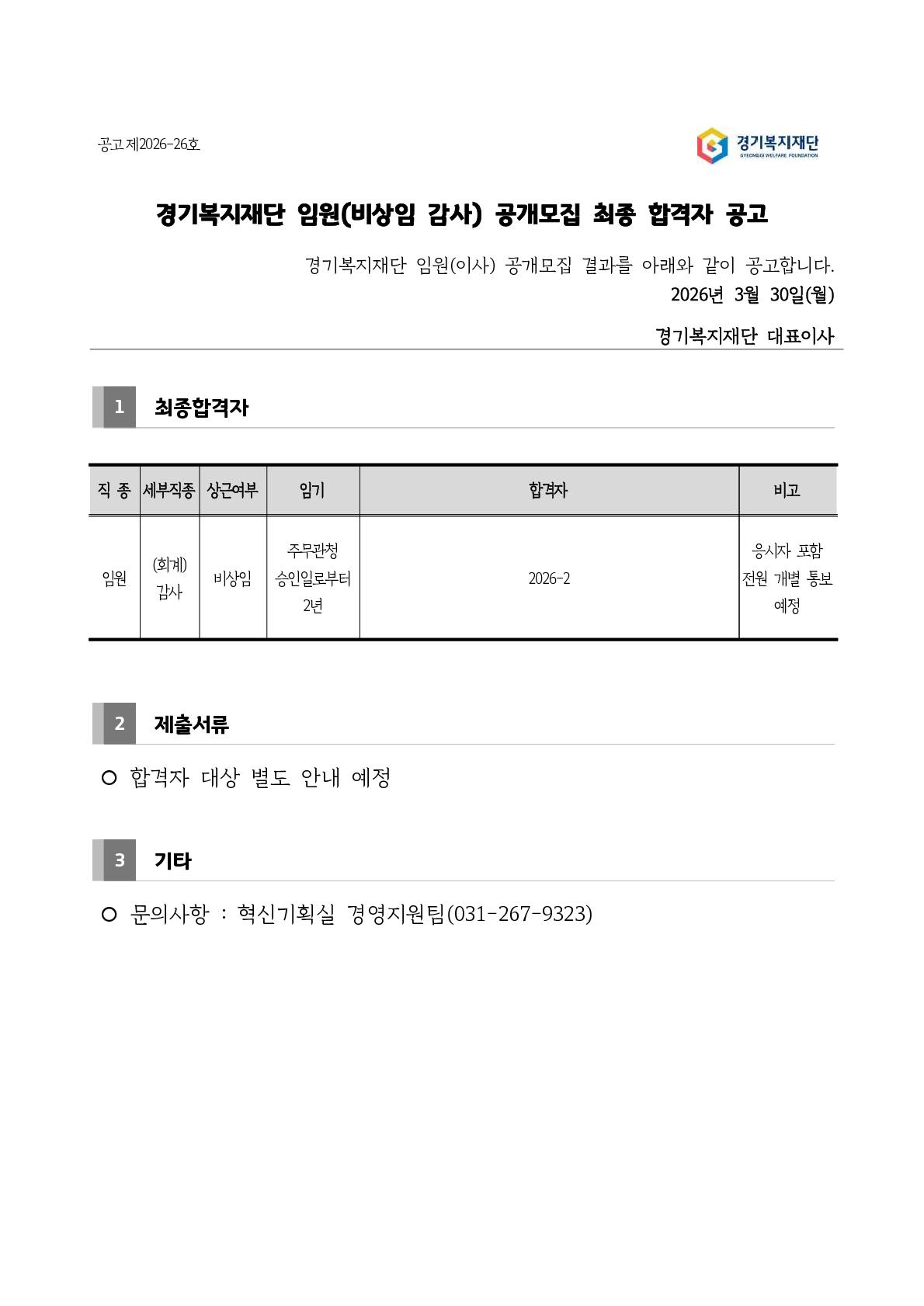 경기복지재단 임원(감사) 공개모집 최종 합격자 공고