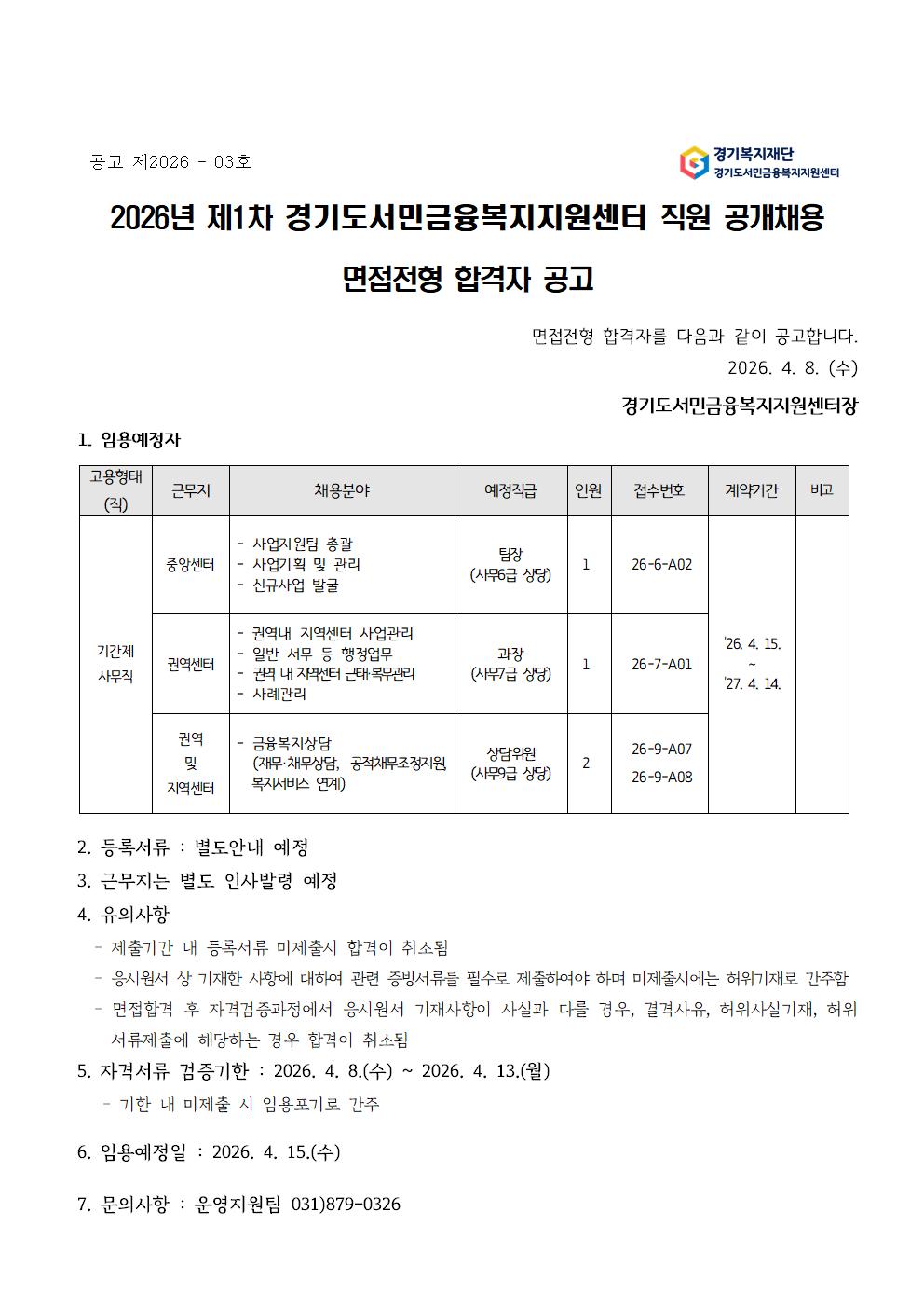 [경기도서민금융복지지원센터]2026년 제1차 경기도서민금융복지지원센터 직원 공개채용 면접전형 합격자 공고