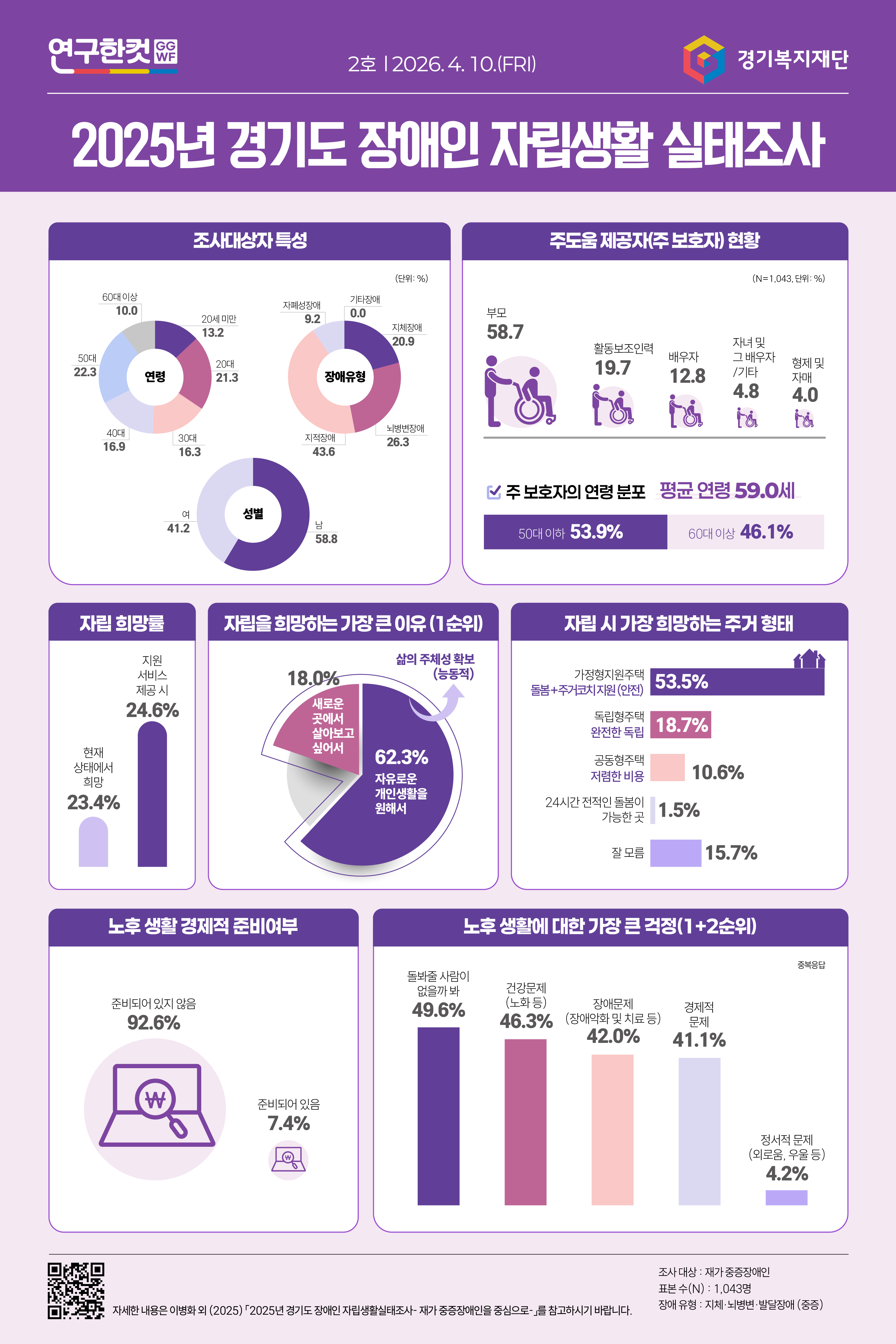 경기복지재단 인포그래픽 “연구한컷” 제2호는 <2025년 경기도 장애인 자립생활 실태조사>의 내용을 담았습니다.