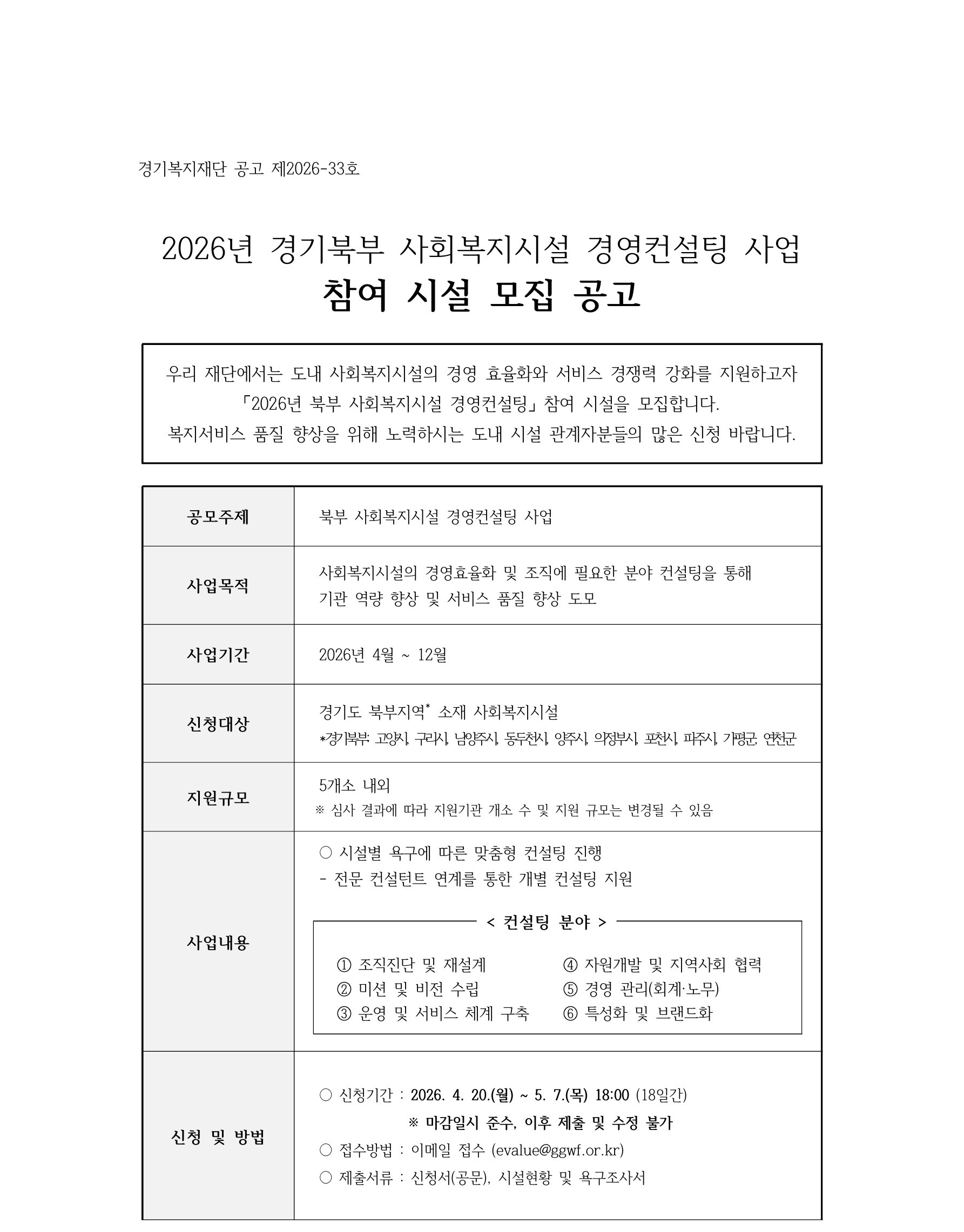 [경기복지재단 공고 제2026-33호] 2026년 경기북부 사회복지시설 경영컨설팅 사업 참여 시설 모집 공고