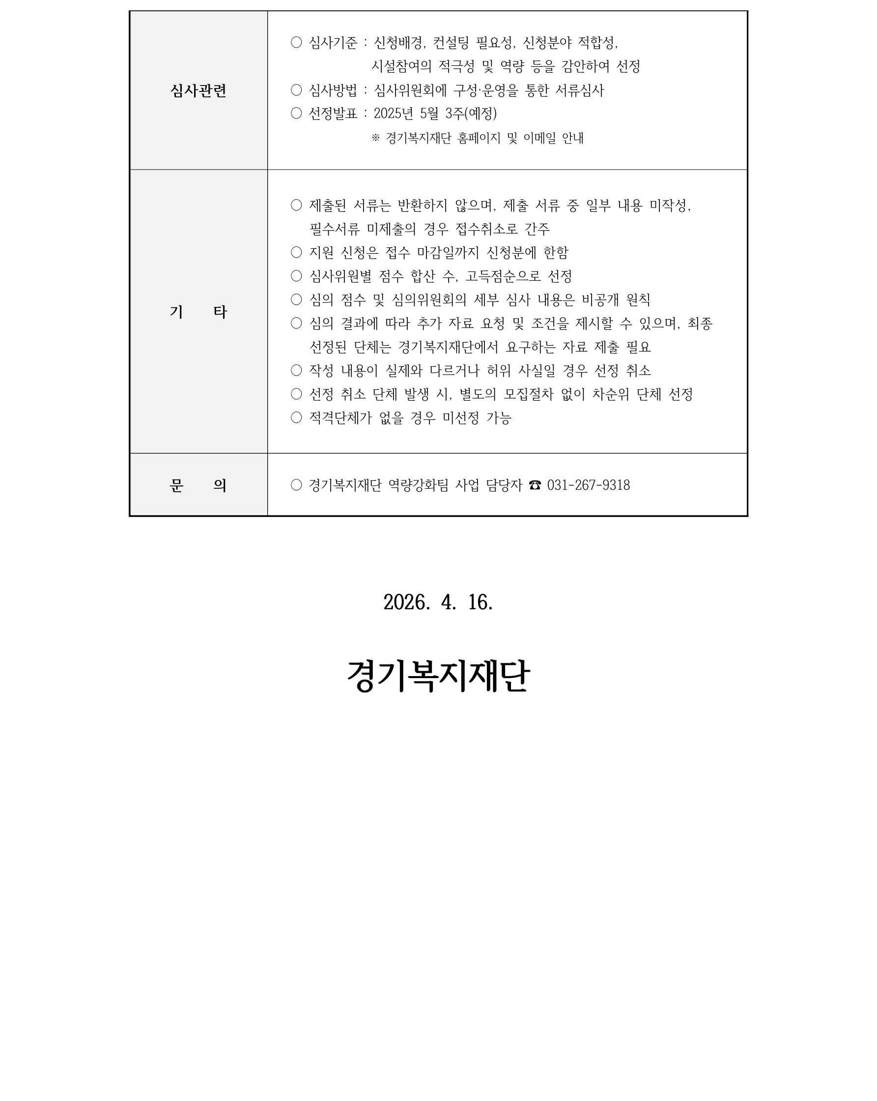 [경기복지재단 공고 제2026-30호] 2026년 「경기복지 현안 지원 사업」 공모 선정결과 공고
