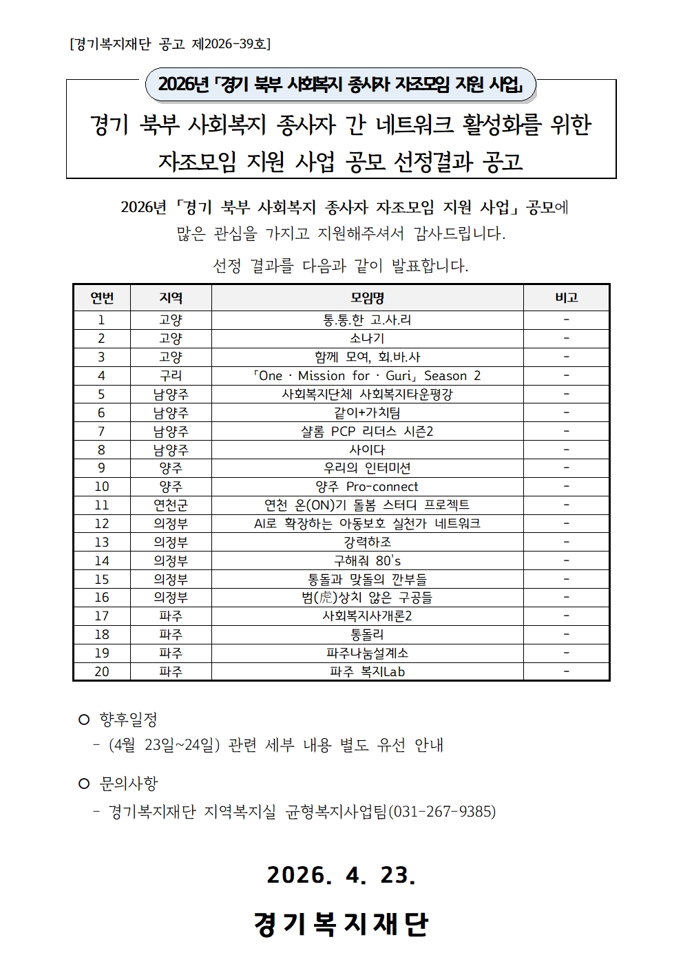 [경기복지재단 공고 제2026-39호] 2026년 「경기 북부 사회복지 종사자 자조모임 지원 사업」 공모 선정결과 공고