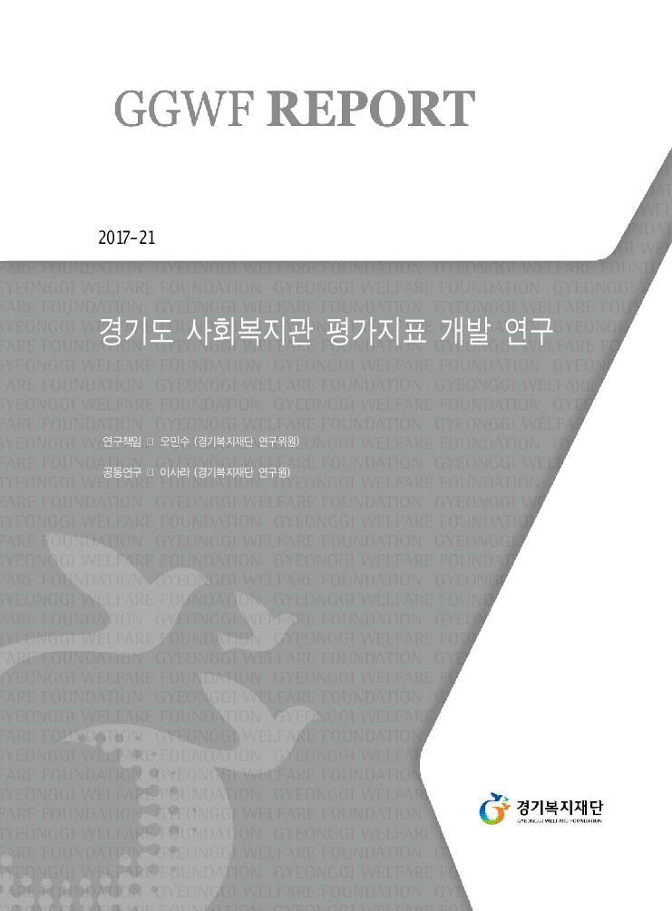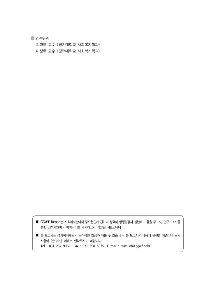 감수위원 김형모 교수 (경기대학교 사회복지학과) 이상무 교수 (평택대학교 사회복지학과) ■ GGWF Report는 사회복지분야의 주요현안에 관하여 정책의 방향설정과 실현에 도움을 주고자, 연구ㆍ조사를 통한 정책제안이나 아이디어를 제시하고자 작성된 자료입니다. ■ 본 보고서는 경기복지재단의 공식적인 입장과 다를 수 있습니다. 본 보고서의 내용과 관련한 의견이나 문의 사항이 있으시면 아래로 연락주시기 바랍니다. Tel : 031-267-9362 Fax : 031-898-5935 E-mail : minsuoh@ggwf.or.kr