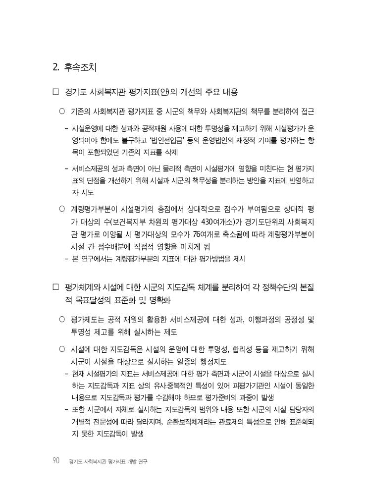 90 경기도 사회복지관 평가지표 개발 연구 2. 후속조치 □ 경기도 사회복지관 평가지표(안)의 개선의 주요 내용 ○ 기존의 사회복지관 평가지표 중 시군의 책무와 사회복지관의 책무를 분리하여 접근 - 시설운영에 대한 성과와 공적재원 사용에 대한 투명성을 제고하기 위해 시설평가가 운 영되어야 함에도 불구하고 ‘법인전입금’ 등의 운영법인의 재정적 기여를 평가하는 항 목이 포함되었던 기존의 지표를 삭제 - 서비스제공의 성과 측면이 아닌 물리적 측면이 시설평가에 영향을 미친다는 현 평가지 표의 단점을 개선하기 위해 시설과 시군의 책무성을 분리하는 방안을 지표에 반영하고 자 시도 ○ 계량평가부분이 시설평가의 총점에서 상대적으로 점수가 부여됨으로 상대적 평 가 대상의 수(보건복지부 차원의 평가대상 430여개소)가 경기도단위의 사회복지 관 평가로 이양될 시 평가대상의 모수가 76여개로 축소됨에 따라 계량평가부분이 시설 간 점수배분에 직접적 영향을 미치게 됨 - 본 연구에서는 계량평가부분의 지표에 대한 평가방법을 제시 □ 평가체계와 시설에 대한 시군의 지도감독 체계를 분리하여 각 정책수단의 본질 적 목표달성의 표준화 및 명확화 ○ 평가제도는 공적 재원의 활용한 서비스제공에 대한 성과, 이행과정의 공정성 및 투명성 제고를 위해 실시하는 제도 ○ 시설에 대한 지도감독은 시설의 운영에 대한 투명성, 합리성 등을 제고하기 위해 시군이 시설을 대상으로 실시하는 일종의 행정지도 - 현재 시설평가의 지표는 서비스제공에 대한 평가 측면과 시군이 시설을 대상으로 실시 하는 지도감독과 지표 상의 유사․중복적인 특성이 있어 피평가기관인 시설이 동일한 내용으로 지도감독과 평가를 수감해야 하므로 평가준비의 과중이 발생 - 또한 시군에서 자체로 실시하는 지도감독의 범위와 내용 또한 시군의 시설 담당자의 개별적 전문성에 따라 달라지며, 순환보직체계라는 관료제의 특성으로 인해 표준화되 지 못한 지도감독이 발생