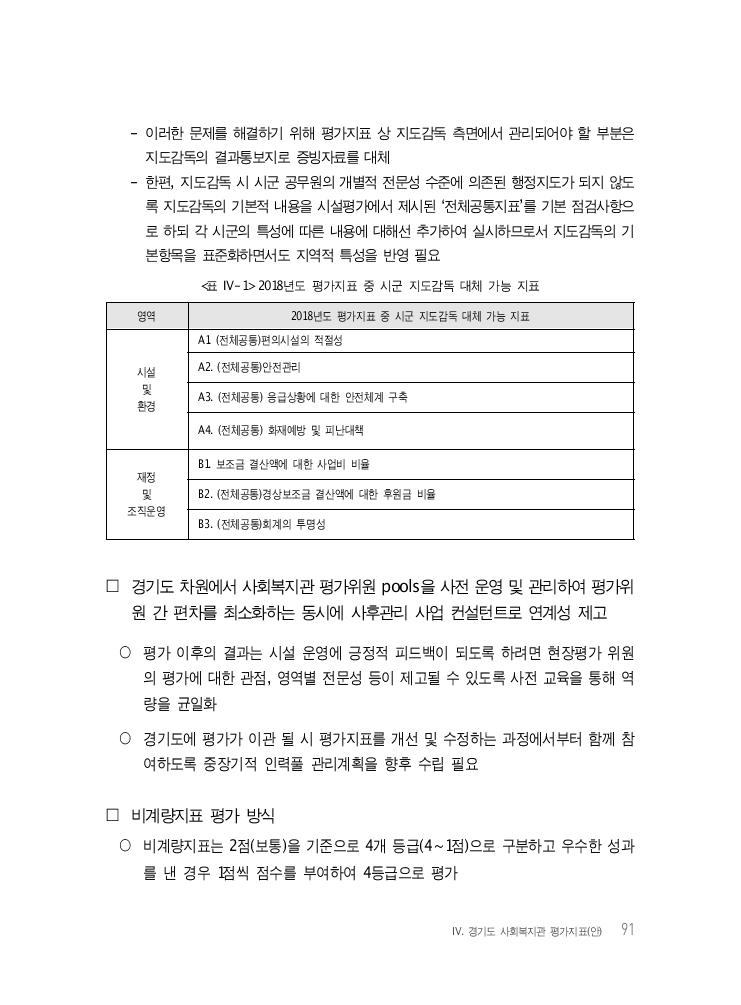 Ⅳ. 경기도 사회복지관 평가지표(안) 91 - 이러한 문제를 해결하기 위해 평가지표 상 지도감독 측면에서 관리되어야 할 부분은 지도감독의 결과통보지로 증빙자료를 대체 - 한편, 지도감독 시 시군 공무원의 개별적 전문성 수준에 의존된 행정지도가 되지 않도 록 지도감독의 기본적 내용을 시설평가에서 제시된 ‘전체공통지표’를 기본 점검사항으 로 하되 각 시군의 특성에 따른 내용에 대해선 추가하여 실시하므로서 지도감독의 기 본항목을 표준화하면서도 지역적 특성을 반영 필요 <표 Ⅳ-1> 2018년도 평가지표 중 시군 지도감독 대체 가능 지표 영역 2018년도 평가지표 중 시군 지도감독 대체 가능 지표 시설 및 환경 A1. (전체공통)편의시설의 적절성 A2. (전체공통)안전관리 A3. (전체공통) 응급상황에 대한 안전체계 구축 A4. (전체공통) 화재예방 및 피난대책 재정 및 조직운영 B1. 보조금 결산액에 대한 사업비 비율 B2. (전체공통)경상보조금 결산액에 대한 후원금 비율 B3. (전체공통)회계의 투명성 □ 경기도 차원에서 사회복지관 평가위원 pools을 사전 운영 및 관리하여 평가위 원 간 편차를 최소화하는 동시에 사후관리 사업 컨설턴트로 연계성 제고 ○ 평가 이후의 결과는 시설 운영에 긍정적 피드백이 되도록 하려면 현장평가 위원 의 평가에 대한 관점, 영역별 전문성 등이 제고될 수 있도록 사전 교육을 통해 역 량을 균일화 ○ 경기도에 평가가 이관 될 시 평가지표를 개선 및 수정하는 과정에서부터 함께 참 여하도록 중장기적 인력풀 관리계획을 향후 수립 필요 □ 비계량지표 평가 방식 ○ 비계량지표는 2점(보통)을 기준으로 4개 등급(4~1점)으로 구분하고 우수한 성과 를 낸 경우 1점씩 점수를 부여하여 4등급으로 평가