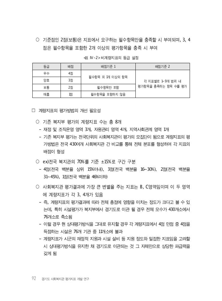 92 경기도 사회복지관 평가지표 개발 연구 ○ 기준점인 2점(보통)은 지표에서 요구하는 필수항목만을 충족할 시 부여되며, 3, 4 점은 필수항목을 포함한 2개 이상의 평가항목을 충족 시 부여 <표 Ⅳ-2> 비계량지표의 등급 설정 등급 배점 배점기준 1 배점기준 2 우수 4점 필수항목 외 1개 이상의 항목 각 지표별로 1~9개 범위 내 평가항목을 충족하는 항목 수를 평가 양호 3점 보통 2점 필수항목만 포함 매흡 1점 필수항목을 포함하지 않음 □ 계량지표의 평가방법의 개선 필요성 ○ 기존 복지부 평가의 계량지표 수는 총 8개 - 재정 및 조직운영 영역 3개, 자원관리 영역 4개, 지역사회관계 영역 1개 - 기존 복지부 평가는 전국단위의 사회복지관이 평가의 모집단이 됨으로 계량지표의 평 가방법은 전국 430여개 사회복지관 간 비교를 통해 전체 분포를 형성하여 각 지표의 배점이 형성 ○ ex)전국 복지관의 70%를 기준 ±15%로 구간 구분 - 4점(전국 백분율 상위 15%이내), 3점(전국 백분율 16~30%), 2점(전국 백분율 31~45%), 1점(전국 백분율 46%이하) ○ 사회복지관 평가결과에 가장 큰 변별을 주는 지표는 B, C영역임이며 이 두 영역 에 계량지표가 각 3, 4개가 있음 - 즉, 계량지표의 평가결과에 따라 전체 총점에 영향을 미치는 정도가 크다고 볼 수 있 는데, 특히 시설평가가 복지부에서 경기도로 이관 될 경우 전체 모수가 430개소에서 76개소로 축소됨 - 이럴 경우 현 상대평가방식을 그대로 유지할 경우 각 계량지표에서 4점 만점 중 4점을 득점하는 시설은 76개 기관 중 11개소에 불과 - 계량지표가 시군의 재정적 지원과 시설 설비 등 지원 정도와 밀접한 지표임을 고려할 시 상대평가방식을 유지한 채 경기도로 이관되는 것 그 자체만으로 상당한 파급력을 갖게 됨