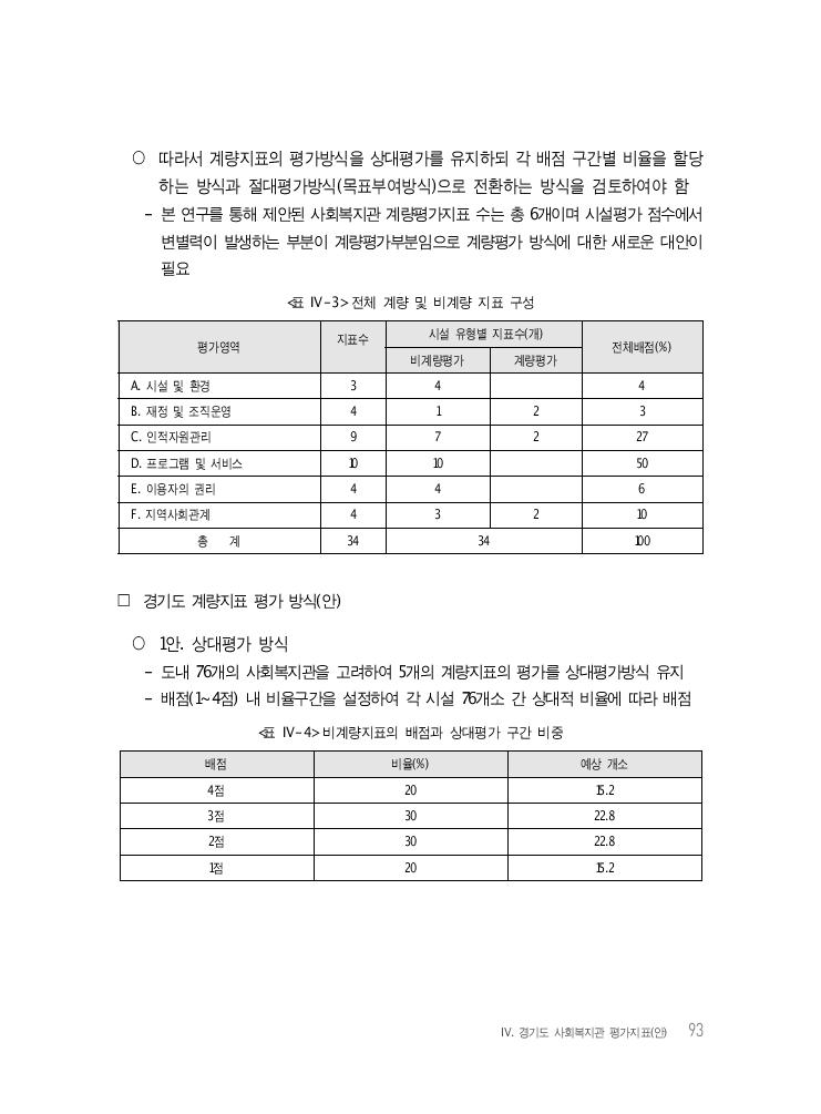 Ⅳ. 경기도 사회복지관 평가지표(안) 93 ○ 따라서 계량지표의 평가방식을 상대평가를 유지하되 각 배점 구간별 비율을 할당 하는 방식과 절대평가방식(목표부여방식)으로 전환하는 방식을 검토하여야 함 - 본 연구를 통해 제안된 사회복지관 계량평가지표 수는 총 6개이며 시설평가 점수에서 변별력이 발생하는 부분이 계량평가부분임으로 계량평가 방식에 대한 새로운 대안이 필요 <표 Ⅳ-3> 전체 계량 및 비계량 지표 구성 평가영역 지표수 시설 유형별 지표수(개) 전체배점(%) 비계량평가 계량평가 A. 시설 및 환경 3 4 4 B. 재정 및 조직운영 4 1 2 3 C. 인적자원관리 9 7 2 27 D. 프로그램 및 서비스 10 10 50 E. 이용자의 권리 4 4 6 F. 지역사회관계 4 3 2 10 총 계 34 34 100 □ 경기도 계량지표 평가 방식(안) ○ 1안. 상대평가 방식 - 도내 76개의 사회복지관을 고려하여 5개의 계량지표의 평가를 상대평가방식 유지 - 배점(1~4점) 내 비율구간을 설정하여 각 시설 76개소 간 상대적 비율에 따라 배점 <표 Ⅳ-4> 비계량지표의 배점과 상대평가 구간 비중 배점 비율(%) 예상 개소 4점 20 15.2 3점 30 22.8 2점 30 22.8 1점 20 15.2