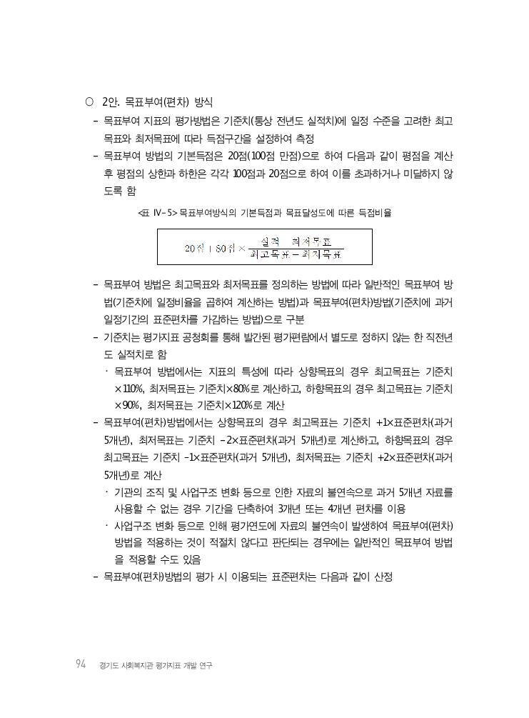 94 경기도 사회복지관 평가지표 개발 연구 ○ 2안. 목표부여(편차) 방식 - 목표부여 지표의 평가방법은 기준치(통상 전년도 실적치)에 일정 수준을 고려한 최고 목표와 최저목표에 따라 득점구간을 설정하여 측정 - 목표부여 방법의 기본득점은 20점(100점 만점)으로 하여 다음과 같이 평점을 계산 후 평점의 상한과 하한은 각각 100점과 20점으로 하여 이를 초과하거나 미달하지 않 도록 함 <표 Ⅳ-5> 목표부여방식의 기본득점과 목표달성도에 따른 득점비율 - 목표부여 방법은 최고목표와 최저목표를 정의하는 방법에 따라 일반적인 목표부여 방 법(기준치에 일정비율을 곱하여 계산하는 방법)과 목표부여(편차)방법(기준치에 과거 일정기간의 표준편차를 가감하는 방법)으로 구분 - 기준치는 평가지표 공청회를 통해 발간된 평가편람에서 별도로 정하지 않는 한 직전년 도 실적치로 함 ・ 목표부여 방법에서는 지표의 특성에 따라 상향목표의 경우 최고목표는 기준치 ×110%, 최저목표는 기준치×80%로 계산하고, 하향목표의 경우 최고목표는 기준치 ×90%, 최저목표는 기준치×120%로 계산 - 목표부여(편차)방법에서는 상향목표의 경우 최고목표는 기준치 +1×표준편차(과거 5개년), 최저목표는 기준치 -2×표준편차(과거 5개년)로 계산하고, 하향목표의 경우 최고목표는 기준치 –1×표준편차(과거 5개년), 최저목표는 기준치 +2×표준편차(과거 5개년)로 계산 ・ 기관의 조직 및 사업구조 변화 등으로 인한 자료의 불연속으로 과거 5개년 자료를 사용할 수 없는 경우 기간을 단축하여 3개년 또는 4개년 편차를 이용 ・ 사업구조 변화 등으로 인해 평가연도에 자료의 불연속이 발생하여 목표부여(편차) 방법을 적용하는 것이 적절치 않다고 판단되는 경우에는 일반적인 목표부여 방법 을 적용할 수도 있음 - 목표부여(편차)방법의 평가 시 이용되는 표준편차는 다음과 같이 산정