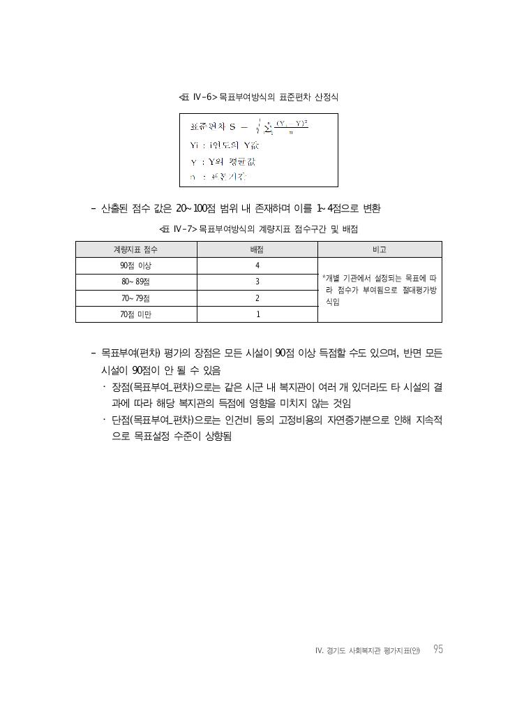 Ⅳ. 경기도 사회복지관 평가지표(안) 95 <표 Ⅳ-6> 목표부여방식의 표준편차 산정식 - 산출된 점수 값은 20~100점 범위 내 존재하며 이를 1~4점으로 변환 <표 Ⅳ-7> 목표부여방식의 계량지표 점수구간 및 배점 계량지표 점수 배점 비고 90점 이상 4 *개별 기관에서 설정되는 목표에 따 라 점수가 부여됨으로 절대평가방 식임 80~89점 3 70~79점 2 70점 미만 1 - 목표부여(편차) 평가의 장점은 모든 시설이 90점 이상 득점할 수도 있으며, 반면 모든 시설이 90점이 안 될 수 있음 ・ 장점(목표부여_편차)으로는 같은 시군 내 복지관이 여러 개 있더라도 타 시설의 결 과에 따라 해당 복지관의 득점에 영향을 미치지 않는 것임 ・ 단점(목표부여_편차)으로는 인건비 등의 고정비용의 자연증가분으로 인해 지속적 으로 목표설정 수준이 상향됨