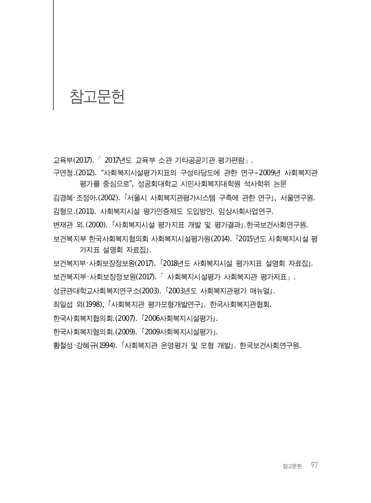 참고문헌 97 참고문헌 교육부(2017). 「2017년도 교육부 소관 기타공공기관 평가편람」. 구연청.(2012). “사회복지시설평가지표의 구성타당도에 관한 연구-2009년 사회복지관 평가를 중심으로”, 성공회대학교 시민사회복지대학원 석사학위 논문 김경혜・조정아.(2002). 「서울시 사회복지관평가시스템 구축에 관한 연구」, 서울연구원. 김형모.(2011). 사회복지시설 평가인증제도 도입방안. 임상사회사업연구. 변재관 외.(2000). 「사회복지시설 평가지표 개발 및 평가결과」.한국보건사회연구원. 보건복지부 한국사회복지협의회 사회복지시설평가원(2014). 「2015년도 사회복지시설 평 가지표 설명회 자료집」. 보건복지부・사회보장정보원(2017). 「2018년도 사회복지시설 평가지표 설명회 자료집」. 보건복지부・사회보장정보원(2017). 「사회복지시설평가 사회복지관 평가지표」. 성균관대학교사회복지연구소(2003). 「2003년도 사회복지관평가 매뉴얼」. 최일섭 외(1998), 「사회복지관 평가모형개발연구」. 한국사회복지관협회. 한국사회복지협의회.(2007). 「2006사회복지시설평가」. 한국사회복지협의회.(2009). 「2009사회복지시설평가」. 황철성・강혜규(1994). 「사회복지관 운영평가 및 모형 개발」. 한국보건사회연구원.