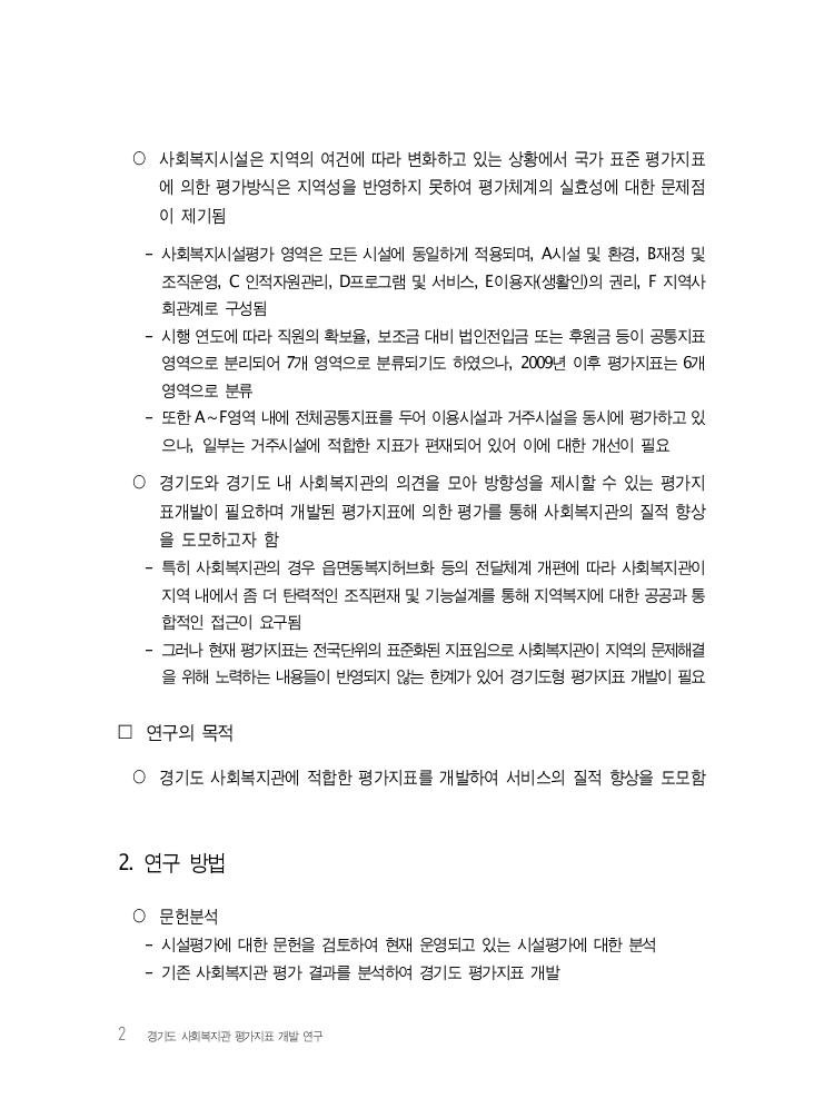 2 경기도 사회복지관 평가지표 개발 연구 ○ 사회복지시설은 지역의 여건에 따라 변화하고 있는 상황에서 국가 표준 평가지표 에 의한 평가방식은 지역성을 반영하지 못하여 평가체계의 실효성에 대한 문제점 이 제기됨 - 사회복지시설평가 영역은 모든 시설에 동일하게 적용되며, A시설 및 환경, B재정 및 조직운영, C 인적자원관리, D프로그램 및 서비스, E이용자(생활인)의 권리, F 지역사 회관계로 구성됨 - 시행 연도에 따라 직원의 확보율, 보조금 대비 법인전입금 또는 후원금 등이 공통지표 영역으로 분리되어 7개 영역으로 분류되기도 하였으나, 2009년 이후 평가지표는 6개 영역으로 분류 - 또한 A~F영역 내에 전체공통지표를 두어 이용시설과 거주시설을 동시에 평가하고 있 으나, 일부는 거주시설에 적합한 지표가 편재되어 있어 이에 대한 개선이 필요 ○ 경기도와 경기도 내 사회복지관의 의견을 모아 방향성을 제시할 수 있는 평가지 표개발이 필요하며 개발된 평가지표에 의한 평가를 통해 사회복지관의 질적 향상 을 도모하고자 함 - 특히 사회복지관의 경우 읍면동복지허브화 등의 전달체계 개편에 따라 사회복지관이 지역 내에서 좀 더 탄력적인 조직편재 및 기능설계를 통해 지역복지에 대한 공공과 통 합적인 접근이 요구됨 - 그러나 현재 평가지표는 전국단위의 표준화된 지표임으로 사회복지관이 지역의 문제해결 을 위해 노력하는 내용들이 반영되지 않는 한계가 있어 경기도형 평가지표 개발이 필요 □ 연구의 목적 ○ 경기도 사회복지관에 적합한 평가지표를 개발하여 서비스의 질적 향상을 도모함 2. 연구 방법 ○ 문헌분석 - 시설평가에 대한 문헌을 검토하여 현재 운영되고 있는 시설평가에 대한 분석 - 기존 사회복지관 평가 결과를 분석하여 경기도 평가지표 개발