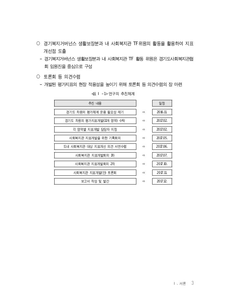 Ⅰ. 서론 3 ○ 경기복지거버넌스 생활보장분과 내 사회복지관 TF위원의 활동을 활용하여 지표 개선점 도출 - 경기복지거버넌스 생활보장분과 내 사회복지관 TF 활동 위원은 경기도사회복지관협 회 임원진을 중심으로 구성 ○ 토론회 등 의견수렴 - 개발된 평가지표의 현장 적용성을 높이기 위해 토론회 등 의견수렴의 장 마련 <표 Ⅰ-1> 연구의 추친체계 추진 내용 일정 경기도 차원의 평가체계 운용 필요성 제기 ⇨ 2016.11. 경기도 차원의 평가지표개발(11개 영역) 수탁 ⇨ 2017.02. 각 영역별 지표개발 담당자 지정 ⇨ 2017.02. 사회복지관 지표개발을 위한 기획회의 ⇨ 2017.05. 도내 사회복지관 대상 지표개선 의견 서면수렴 ⇨ 2017.06. 사회복지관 지표개발회의 1차 ⇨ 2017.07. 사회복지관 지표개발회의 2차 ⇨ 2017.10. 사회복지관 지표개발(안) 토론회 ⇨ 2017.11. 보고서 작성 및 발간 ⇨ 2017.12.