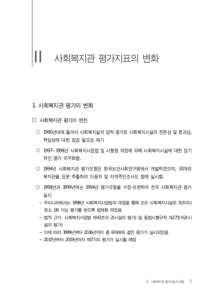 Ⅱ. 사회복지관 평가지표의 변화 5 Ⅱ 사회복지관 평가지표의 변화 1. 사회복지관 평가의 변화 □ 사회복지관 평가의 변천 ○ 1990년대에 들어서 사회복지설의 양적 증가로 사회복지시설의 전문성 및 효과성, 책임성에 대한 점검 필요성 제기 ○ 1997~1998년 사회복지사업법 및 시행령 개정에 의해 사회복지시설에 대한 정기 적인 평가 의무화함. ○ 1994년 사회복지관 평가모형은 한국보건사회연구원에서 개발하였으며, 30개의 복지관을 표본 추출하여 이용자 및 지역주민조사도 함께 실시함. ○ 1998년과 1999년에는 1994년 평가모형을 수정·보완하여 전국 사회복지관 평가 실시 - 우리나라에서는 1998년 사회복지사업법의 개정을 통해 모든 사회복지시설은 3년마다 최소 1회 이상 평가를 받도록 법제화 되었음 - 법적 근거: 사회복지사업법 제43조의 2(시설의 평가) 및 동법시행규칙 제27조의2(시 설의 평가) - 이에 따라 1999년부터 2016년까지 총 6차례에 걸친 평가가 실시되었음 - 2017년부터 2019년까지 제7기의 평가가 실시될 예정