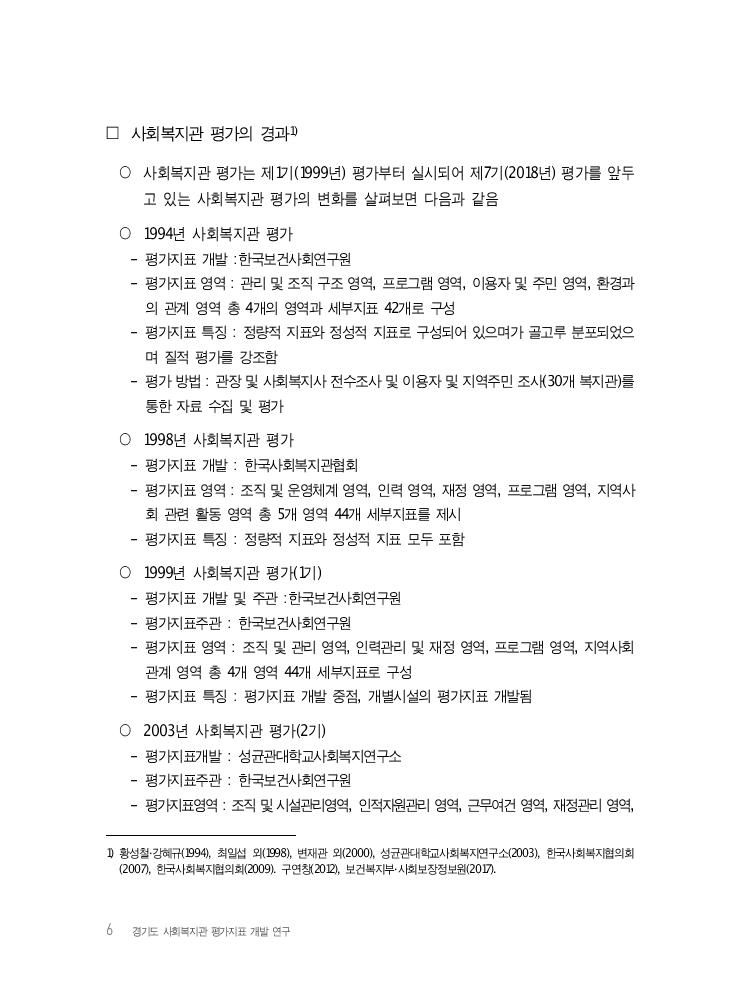 6 경기도 사회복지관 평가지표 개발 연구 □ 사회복지관 평가의 경과1) ○ 사회복지관 평가는 제1기(1999년) 평가부터 실시되어 제7기(2018년) 평가를 앞두 고 있는 사회복지관 평가의 변화를 살펴보면 다음과 같음 ○ 1994년 사회복지관 평가 - 평가지표 개발 :한국보건사회연구원 - 평가지표 영역 : 관리 및 조직 구조 영역, 프로그램 영역, 이용자 및 주민 영역, 환경과 의 관계 영역 총 4개의 영역과 세부지표 42개로 구성 - 평가지표 특징 : 정량적 지표와 정성적 지표로 구성되어 있으며가 골고루 분포되었으 며 질적 평가를 강조함 - 평가 방법 : 관장 및 사회복지사 전수조사 및 이용자 및 지역주민 조사(30개 복지관)를 통한 자료 수집 및 평가 ○ 1998년 사회복지관 평가 - 평가지표 개발 : 한국사회복지관협회 - 평가지표 영역 : 조직 및 운영체계 영역, 인력 영역, 재정 영역, 프로그램 영역, 지역사 회 관련 활동 영역 총 5개 영역 44개 세부지표를 제시 - 평가지표 특징 : 정량적 지표와 정성적 지표 모두 포함 ○ 1999년 사회복지관 평가(1기) - 평가지표 개발 및 주관 :한국보건사회연구원 - 평가지표주관 : 한국보건사회연구원 - 평가지표 영역 : 조직 및 관리 영역, 인력관리 및 재정 영역, 프로그램 영역, 지역사회 관계 영역 총 4개 영역 44개 세부지표로 구성 - 평가지표 특징 : 평가지표 개발 중점, 개별시설의 평가지표 개발됨 ○ 2003년 사회복지관 평가(2기) - 평가지표개발 : 성균관대학교사회복지연구소 - 평가지표주관 : 한국보건사회연구원 - 평가지표영역 : 조직 및 시설관리영역, 인적자원관리 영역, 근무여건 영역, 재정관리 영역, 1) 황성철·강혜규(1994), 최일섭 외(1998), 변재관 외(2000), 성균관대학교사회복지연구소(2003), 한국사회복지협의회 (2007), 한국사회복지협의회(2009). 구연창(2012), 보건복지부·사회보장정보원(2017).
