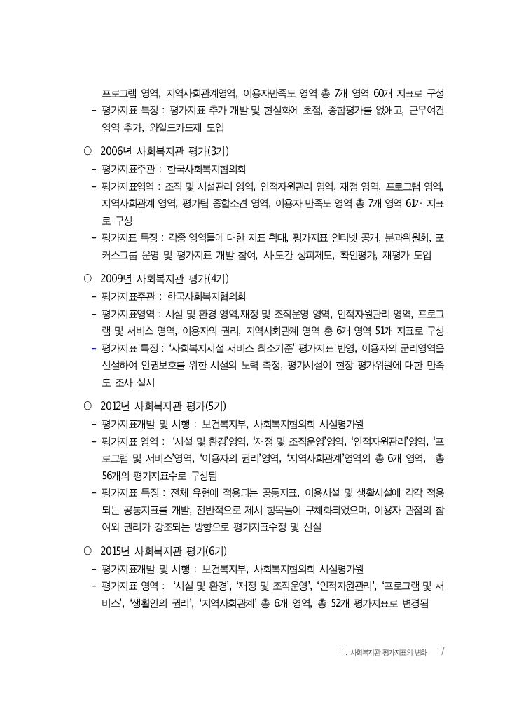 Ⅱ. 사회복지관 평가지표의 변화 7 프로그램 영역, 지역사회관계영역, 이용자만족도 영역 총 7개 영역 60개 지표로 구성 - 평가지표 특징 : 평가지표 추가 개발 및 현실화에 초점, 종합평가를 없애고, 근무여건 영역 추가, 와일드카드제 도입 ○ 2006년 사회복지관 평가(3기) - 평가지표주관 : 한국사회복지협의회 - 평가지표영역 : 조직 및 시설관리 영역, 인적자원관리 영역, 재정 영역, 프로그램 영역, 지역사회관계 영역, 평가팀 종합소견 영역, 이용자 만족도 영역 총 7개 영역 61개 지표 로 구성 - 평가지표 특징 : 각종 영역들에 대한 지표 확대, 평가지표 인터넷 공개, 분과위원회, 포 커스그룹 운영 및 평가지표 개발 참여, 시·도간 상피제도, 확인평가, 재평가 도입 ○ 2009년 사회복지관 평가(4기) - 평가지표주관 : 한국사회복지협의회 - 평가지표영역 : 시설 및 환경 영역,재정 및 조직운영 영역, 인적자원관리 영역, 프로그 램 및 서비스 영역, 이용자의 권리, 지역사회관계 영역 총 6개 영역 51개 지표로 구성 - 평가지표 특징 : ‘사회복지시설 서비스 최소기준’ 평가지표 반영, 이용자의 군리영역을 신설하여 인권보호를 위한 시설의 노력 측정, 평가시설이 현장 평가위원에 대한 만족 도 조사 실시 ○ 2012년 사회복지관 평가(5기) - 평가지표개발 및 시행 : 보건복지부, 사회복지협의회 시설평가원 - 평가지표 영역 : ‘시설 및 환경’영역, ‘재정 및 조직운영’영역, ‘인적자원관리’영역, ‘프 로그램 및 서비스’영역, ‘이용자의 권리’영역, ‘지역사회관계’영역의 총 6개 영역, 총 56개의 평가지표수로 구성됨 - 평가지표 특징 : 전체 유형에 적용되는 공통지표, 이용시설 및 생활시설에 각각 적용 되는 공통지표를 개발, 전반적으로 제시 항목들이 구체화되었으며, 이용자 관점의 참 여와 권리가 강조되는 방향으로 평가지표수정 및 신설 ○ 2015년 사회복지관 평가(6기) - 평가지표개발 및 시행 : 보건복지부, 사회복지협의회 시설평가원 - 평가지표 영역 : ‘시설 및 환경’, ‘재정 및 조직운영’, ‘인적자원관리’, ‘프로그램 및 서 비스’, ‘생활인의 권리’, ‘지역사회관계’ 총 6개 영역, 총 52개 평가지표로 변경됨