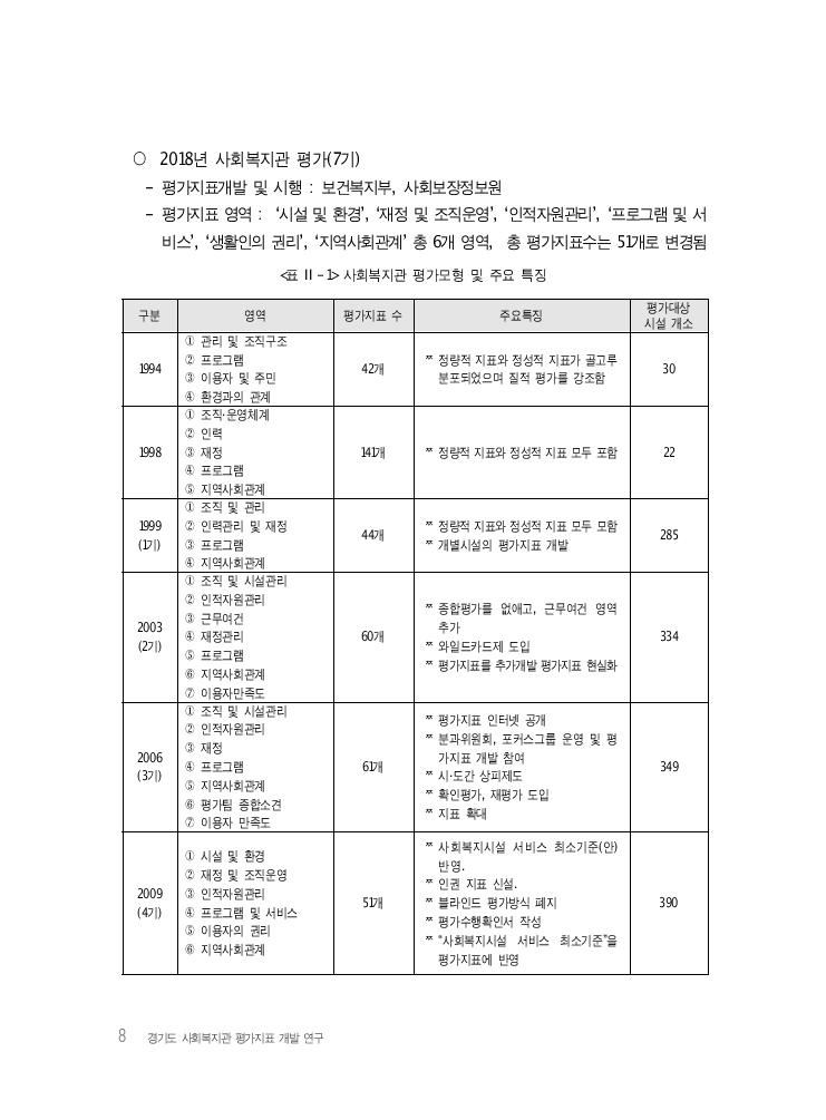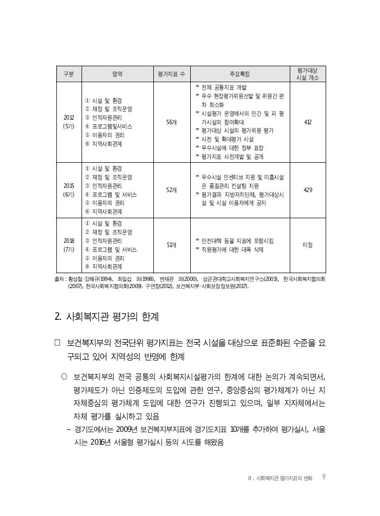 8 경기도 사회복지관 평가지표 개발 연구 구분 영역 평가지표 수 주요특징 평가대상시설 개소 1994 ① 관리 및 조직구조 ② 프로그램 ③ 이용자 및 주민 ④ 환경과의 관계 42개 정량적 지표와 정성적 지표가 골고루 분포되었으며 질적 평가를 강조함 30 1998 ① 조직·운영체계 ② 인력 ③ 재정 ④ 프로그램 ⑤ 지역사회관계 141개 정량적 지표와 정성적 지표 모두 포함 22 1999 (1기) ① 조직 및 관리 ② 인력관리 및 재정 ③ 프로그램 ④ 지역사회관계 44개 정량적 지표와 정성적 지표 모두 모함 개별시설의 평가지표 개발 285 2003 (2기) ① 조직 및 시설관리 ② 인적자원관리 ③ 근무여건 ④ 재정관리 ⑤ 프로그램 ⑥ 지역사회관계 ⑦ 이용자만족도 60개 종합평가를 없애고, 근무여건 영역 추가 와일드카드제 도입 평가지표를 추가개발 평가지표 현실화 334 2006 (3기) ① 조직 및 시설관리 ② 인적자원관리 ③ 재정 ④ 프로그램 ⑤ 지역사회관계 ⑥ 평가팀 종합소견 ⑦ 이용자 만족도 61개 평가지표 인터넷 공개 분과위원회, 포커스그룹 운영 및 평 가지표 개발 참여 시·도간 상피제도 확인평가, 재평가 도입 지표 확대 349 2009 (4기) ① 시설 및 환경 ② 재정 및 조직운영 ③ 인적자원관리 ④ 프로그램 및 서비스 ⑤ 이용자의 권리 ⑥ 지역사회관계 51개 사회복지시설 서비스 최소기준(안) 반영. 인권 지표 신설. 블라인드 평가방식 폐지 평가수행확인서 작성 “사회복지시설 서비스 최소기준”을 평가지표에 반영 390 ○ 2018년 사회복지관 평가(7기) - 평가지표개발 및 시행 : 보건복지부, 사회보장정보원 - 평가지표 영역 : ‘시설 및 환경’, ‘재정 및 조직운영’, ‘인적자원관리’, ‘프로그램 및 서 비스’, ‘생활인의 권리’, ‘지역사회관계’ 총 6개 영역, 총 평가지표수는 51개로 변경됨 <표 Ⅱ-1> 사회복지관 평가모형 및 주요 특징