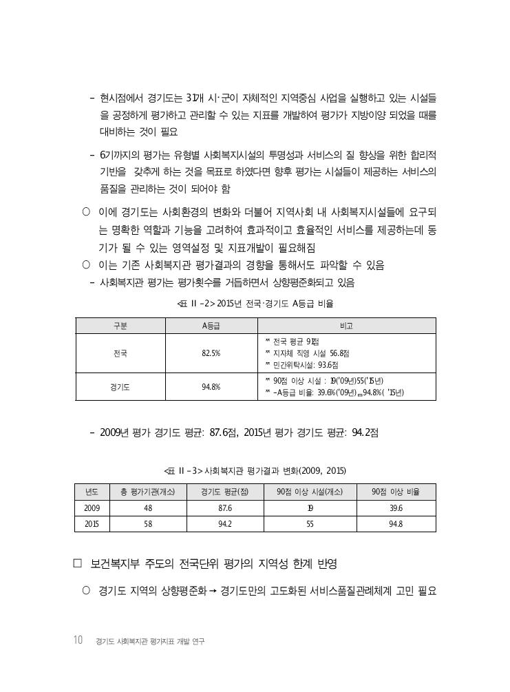10 경기도 사회복지관 평가지표 개발 연구 - 현시점에서 경기도는 31개 시・군이 자체적인 지역중심 사업을 실행하고 있는 시설들 을 공정하게 평가하고 관리할 수 있는 지표를 개발하여 평가가 지방이양 되었을 때를 대비하는 것이 필요 - 6기까지의 평가는 유형별 사회복지시설의 투명성과 서비스의 질 향상을 위한 합리적 기반을 갖추게 하는 것을 목표로 하였다면 향후 평가는 시설들이 제공하는 서비스의 품질을 관리하는 것이 되어야 함 ○ 이에 경기도는 사회환경의 변화와 더불어 지역사회 내 사회복지시설들에 요구되 는 명확한 역할과 기능을 고려하여 효과적이고 효율적인 서비스를 제공하는데 동 기가 될 수 있는 영역설정 및 지표개발이 필요해짐 ○ 이는 기존 사회복지관 평가결과의 경향을 통해서도 파악할 수 있음 - 사회복지관 평가는 평가횟수를 거듭하면서 상향평준화되고 있음 <표 Ⅱ-2> 2015년 전국・경기도 A등급 비율 구분 A등급 비고 전국 82.5% 전국 평균 91점 지자체 직영 시설 56.8점 민간위탁시설: 93.6점 경기도 94.8% 90점 이상 시설 : 19(’09년)55(’15년) -A등급 비율: 39.6%(’09년)94.8%( ’15년) - 2009년 평가 경기도 평균: 87.6점, 2015년 평가 경기도 평균: 94.2점 <표 Ⅱ-3> 사회복지관 평가결과 변화(2009, 2015) 년도 총 평가기관(개소) 경기도 평균(점) 90점 이상 시설(개소) 90점 이상 비율 2009 48 87.6 19 39.6 2015 58 94.2 55 94.8 □ 보건복지부 주도의 전국단위 평가의 지역성 한계 반영 ○ 경기도 지역의 상향평준화→경기도만의 고도화된 서비스품질관례체계 고민 필요