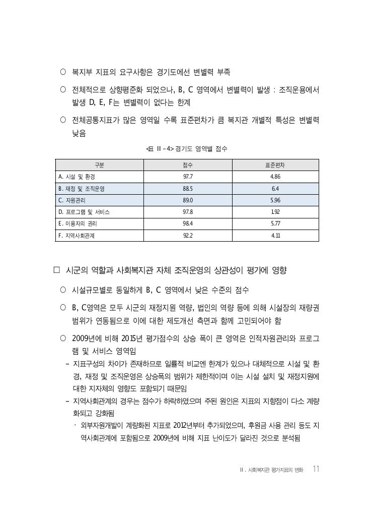 Ⅱ. 사회복지관 평가지표의 변화 11 ○ 복지부 지표의 요구사항은 경기도에선 변별력 부족 ○ 전체적으로 상향평준화 되었으나, B, C 영역에서 변별력이 발생 : 조직운용에서 발생 D, E, F는 변별력이 없다는 한계 ○ 전체공통지표가 많은 영역일 수록 표준편차가 큼 복지관 개별적 특성은 변별력 낮음 <표 Ⅱ-4> 경기도 영역별 점수 구분 점수 표준편차 A. 시설 및 환경 97.7 4.86 B. 재정 및 조직운영 88.5 6.4 C. 자원관리 89.0 5.96 D. 프로그램 및 서비스 97.8 1.92 E. 이용자의 권리 98.4 5.77 F. 지역사회관계 92.2 4.11 □ 시군의 역할과 사회복지관 자체 조직운영의 상관성이 평가에 영향 ○ 시설규모별로 동일하게 B, C 영역에서 낮은 수준의 점수 ○ B, C영역은 모두 시군의 재정지원 역량, 법인의 역량 등에 의해 시설장의 재량권 범위가 연동됨으로 이에 대한 제도개선 측면과 함께 고민되어야 함 ○ 2009년에 비해 2015년 평가점수의 상승 폭이 큰 영역은 인적자원관리와 프로그 램 및 서비스 영역임 - 지표구성의 차이가 존재하므로 일률적 비교엔 한계가 있으나 대체적으로 시설 및 환 경, 재정 및 조직운영은 상승폭의 범위가 제한적이며 이는 시설 설치 및 재정지원에 대한 지자체의 영향도 포함되기 때문임 - 지역사회관계의 경우는 점수가 하락하였으며 주된 원인은 지표의 지향점이 다소 계량 화되고 강화됨 ・ 외부자원개발이 계량화된 지표로 2012년부터 추가되었으며, 후원금 사용 관리 등도 지 역사회관계에 포함됨으로 2009년에 비해 지표 난이도가 달라진 것으로 분석됨