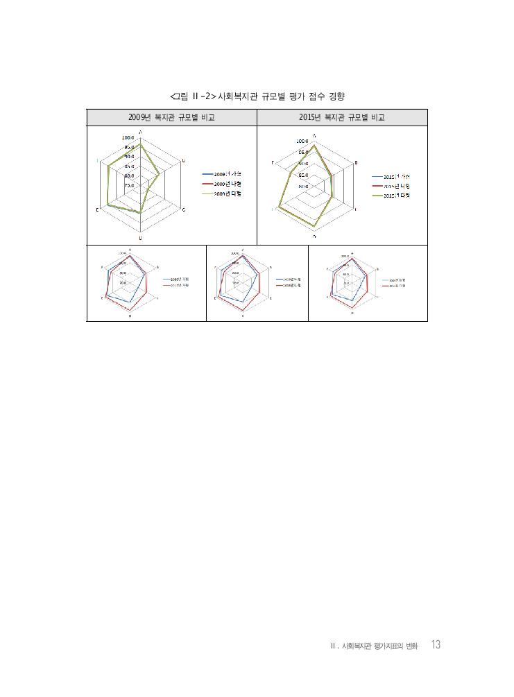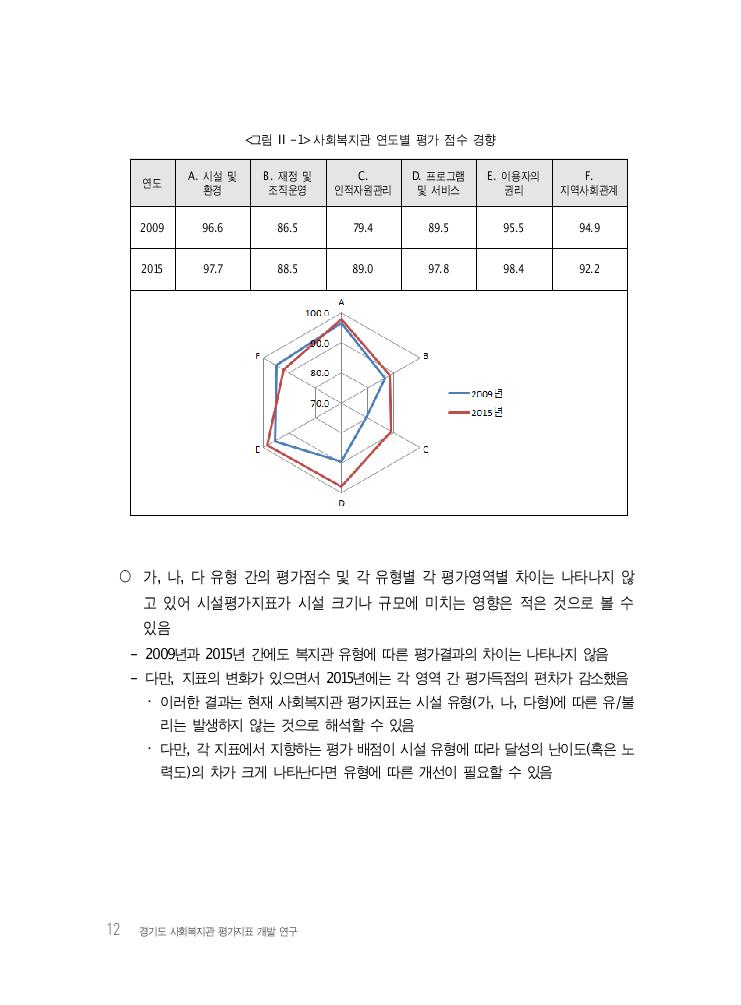 12 경기도 사회복지관 평가지표 개발 연구 <그림 Ⅱ-1> 사회복지관 연도별 평가 점수 경향 연도 A. 시설 및 환경 B. 재정 및 조직운영 C. 인적자원관리 D. 프로그램 및 서비스 E. 이용자의 권리 F. 지역사회관계 2009 96.6 86.5 79.4 89.5 95.5 94.9 2015 97.7 88.5 89.0 97.8 98.4 92.2 ○ 가, 나, 다 유형 간의 평가점수 및 각 유형별 각 평가영역별 차이는 나타나지 않 고 있어 시설평가지표가 시설 크기나 규모에 미치는 영향은 적은 것으로 볼 수 있음 - 2009년과 2015년 간에도 복지관 유형에 따른 평가결과의 차이는 나타나지 않음 - 다만, 지표의 변화가 있으면서 2015년에는 각 영역 간 평가득점의 편차가 감소했음 ・ 이러한 결과는 현재 사회복지관 평가지표는 시설 유형(가, 나, 다형)에 따른 유/불 리는 발생하지 않는 것으로 해석할 수 있음 ・ 다만, 각 지표에서 지향하는 평가 배점이 시설 유형에 따라 달성의 난이도(혹은 노 력도)의 차가 크게 나타난다면 유형에 따른 개선이 필요할 수 있음
