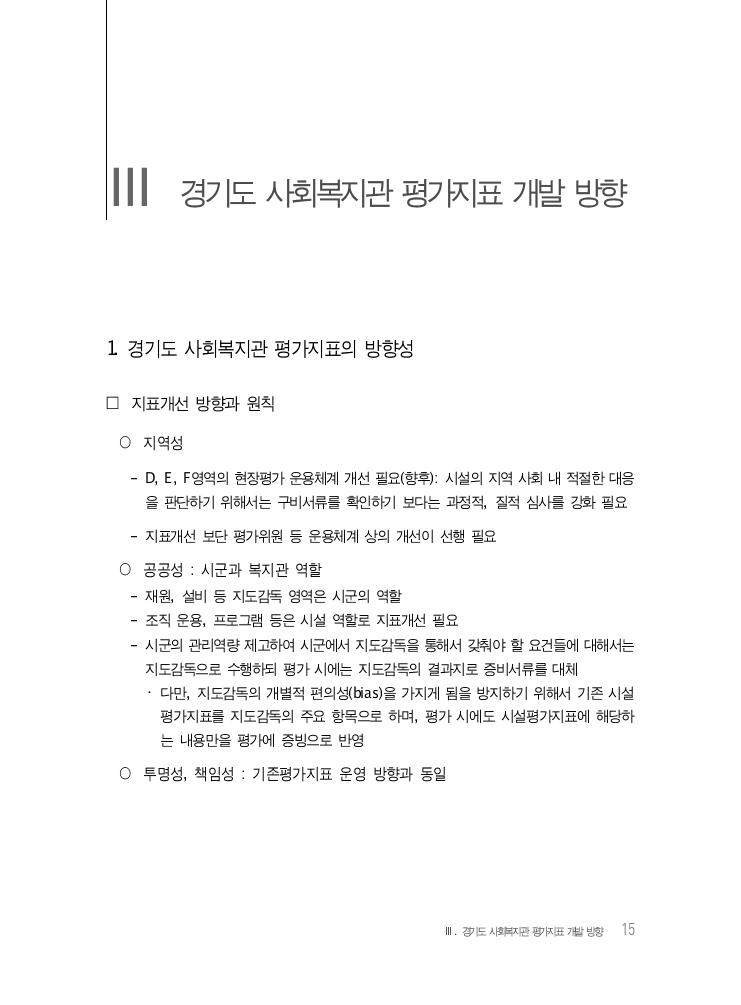 Ⅲ. 경기도 사회복지관 평가지표 개발 방향 15 Ⅲ 경기도 사회복지관 평가지표 개발 방향 1. 경기도 사회복지관 평가지표의 방향성 □ 지표개선 방향과 원칙 ○ 지역성 - D, E, F영역의 현장평가 운용체계 개선 필요(향후): 시설의 지역 사회 내 적절한 대응 을 판단하기 위해서는 구비서류를 확인하기 보다는 과정적, 질적 심사를 강화 필요 - 지표개선 보단 평가위원 등 운용체계 상의 개선이 선행 필요 ○ 공공성 : 시군과 복지관 역할 - 재원, 설비 등 지도감독 영역은 시군의 역할 - 조직 운용, 프로그램 등은 시설 역할로 지표개선 필요 - 시군의 관리역량 제고하여 시군에서 지도감독을 통해서 갖춰야 할 요건들에 대해서는 지도감독으로 수행하되 평가 시에는 지도감독의 결과지로 증비서류를 대체 ・ 다만, 지도감독의 개별적 편의성(bias)을 가지게 됨을 방지하기 위해서 기존 시설 평가지표를 지도감독의 주요 항목으로 하며, 평가 시에도 시설평가지표에 해당하 는 내용만을 평가에 증빙으로 반영 ○ 투명성, 책임성 : 기존평가지표 운영 방향과 동일