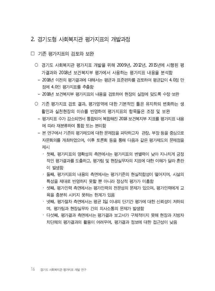 16 경기도 사회복지관 평가지표 개발 연구 2. 경기도형 사회복지관 평가지표의 개발과정 □ 기존 평가지표의 검토와 보완 ○ 경기도 사회복지관 평가지표 개발을 위해 2009년, 2012년, 2015년에 시행된 평 가결과와 2018년 보건복지부 평가에서 사용하는 평가지표 내용을 분석함 - 2018년 이전의 평가결과에 대해서는 평균과 표준편차를 검토하여 평균값이 4.0점 만 점에 4.0인 평가지표를 추출함 - 2018년 보건복지부 평가지표의 내용을 검토하여 현장의 실정에 맞도록 수정・보완 ○ 기존 평가지표 검토 결과, 평가영역에 대한 기본적인 틀은 유지하되 변화하는 생 활인과 실천현장의 이슈를 반영하여 평가지표의 항목들은 조정 및 보완 - 평가지표 수가 감소되면서 통합되어 복합해진 2018 보건복지부 지표를 평가지표 내용 에 따라 재분류하여 통합 또는 분리함 - 본 연구에서 기존의 평가제도에 대한 문제점을 파악하고자 관장, 부장 등을 중심으로 자문회의를 개최하였으며, 이후 토론회 등을 통해 다음과 같은 평가제도의 문제점을 제시 ・ 첫째, 평가지표의 명확성의 측면에서는 평가지표의 변별력이 낮아 지나치게 긍정 적인 평가결과를 도출하고, 평가팀 및 현장실무자의 지표에 대한 이해가 달라 혼란 이 발생함 ・ 둘째, 평가지표의 내용의 측면에서는 평가기준의 현실적합성이 떨어지며, 시설의 특성을 제대로 반영하지 못할 뿐 아니라 정상적 평가가 미흡함 ・ 셋째, 평가인력 측면에서는 평가인력의 전문성의 문제가 있으며, 평가인력에게 교 육을 충분히 시키지 못하는 한계가 있음 ・ 넷째, 평가절차 측면에서는 평균 1일 이내의 단기간 평가에 대한 신뢰성이 저하되 며, 평가팀과 현장실무자 간의 의사소통의 문제가 발생함 ・ 다섯째, 평가결과 측면에서는 평가결과 보고서가 구체적이지 못해 현장과 지방자 치단체의 평가결과의 활용이 어려우며, 평가결과 정보에 대한 접근성이 낮음