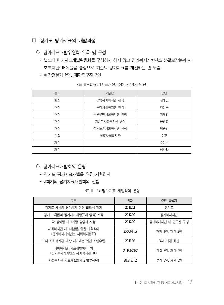Ⅲ. 경기도 사회복지관 평가지표 개발 방향 17 □ 경기도 평가지표의 개발과정 ○ 평가지표개발위원회 위촉 및 구성 - 별도의 평가지표개발위원회를 구성하지 하지 않고 경기복지거버넌스 생활보장분과 사 회복지관 TF위원을 중심으로 기존의 평가지표를 개선하는 안 도출 - 현장전문가 6인, 재단연구진 2인 분야 기관명 명단 현장 광명사회복지관 관장 신혜정 현장 목감사회복지관 관장 강점숙 현장 수원우만사회복지관 관장 황재경 현장 의정부사회복지관 관장 윤연희 현장 성남도촌사회복지관 관장 이종민 현장 부흥사회복지관 이훈 재단 - 오민수 재단 - 이사라 <표 Ⅲ-1> 평가지표개선과정의 참여자 명단 ○ 평가지표개발회의 운영 - 경기도 평가지표개발을 위한 기획회의 - 2회기의 평가지표개발회의 진행 <표 Ⅲ-2> 평가지표 개발회의 운영 구분 일자 주요 참석자 경기도 차원의 평가체계 운용 필요성 제기 2016.11. 경기도 경기도 차원의 평가지표개발(11개 영역) 수탁 2017.02 경기복지재단 각 영역별 지표개발 담당자 지정 2017.02 경기복지재단 내 연구진 구성 사회복지관 지표개발을 위한 기획회의 (경기복지거버넌스 사회복지관TF) 2017.05.18 관장 4인, 재단 2인 도내 사회복지관 대상 지표개선 의견 서면수렴 2017.06 18개 기관 회신 사회복지관 지표개발회의 1차 (경기복지거버넌스 사회복지관 TF) 2017.07.07 관장 3인, 재단 1인 사회복지관 지표개발회의 2차(부장단) 2017.10.12 부장 5인, 재단 1인