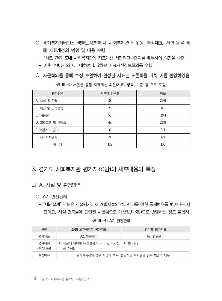 18 경기도 사회복지관 평가지표 개발 연구 ○ 경기복지거버넌스 생활보장분과 내 사회복지관TF 위원, 부장대표, 서면 등을 통 해 지표개선의 범위 및 내용 수렴 - 1차로 76개 도내 사회복지관에 지표개선 서면의견수렴지를 배부하여 의견을 수렴 - 이후 수렴된 의견에 대하여 1, 2차로 지표개선검토회의를 수행 ○ 자문회의를 통해 수정・보완하여 완성된 지표는 토론회를 거쳐 이를 반영하였음 <표 Ⅲ-3> 서면을 통핸 지표개선 의견(지표, 항목, 기준 등 모두 포함) 평가영역 의견제시 빈도 비율 A. 시설 및 환경 38 20.9 B. 재정 및 조직운영 26 14.3 C. 자원관리 53 29.1 D. 프로그램 및 서비스 49 26.9 E. 이용자의 권리 6 3.3 F. 지역사회관계 9 4.9 총 계 182 100 3. 경기도 사회복지관 평가지표(안)의 세부내용의 특징 □ A. 시설 및 환경영역 ○ A2. 안전관리 - “내진설계” 부분은 시설평가에서 개별시설의 성과제고를 위한 통제범위를 벗어나는 지 표이고, 시설 건축물에 관련된 사항임으로 가산점(0.3점)으로 반영하는 것도 불합리 <표 Ⅲ-4> A2. 안전관리 구분 2018 보건복지부 평가지표 경기도 평가지표 평가지표 A2. 안전관리 A2. 안전관리 평가내용 (수정내용) ⑧ 지진에 대비한 내진설계가 되어 있다(가산 점 적용). ⑧ 번 삭제 수정이유 위탁복지관인 경우 시군의 책무, 법인직영 복지관인 경우 법인의 책무