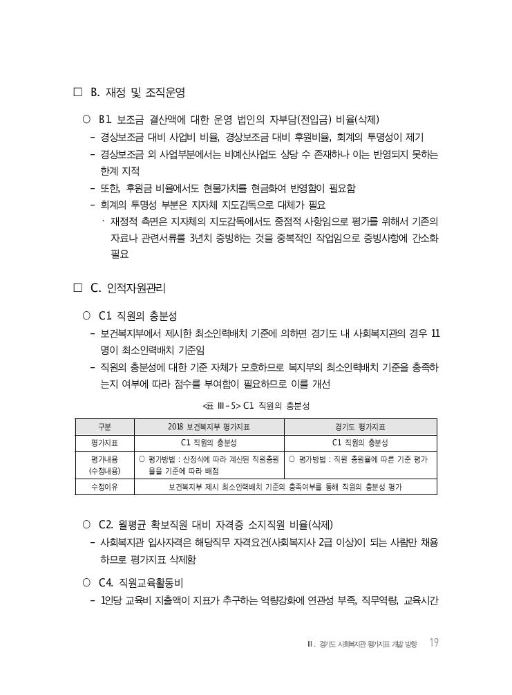 Ⅲ. 경기도 사회복지관 평가지표 개발 방향 19 □ B. 재정 및 조직운영 ○ B1. 보조금 결산액에 대한 운영 법인의 자부담(전입금) 비율(삭제) - 경상보조금 대비 사업비 비율, 경상보조금 대비 후원비율, 회계의 투명성이 제기 - 경상보조금 외 사업부분에서는 비예산사업도 상당 수 존재하나 이는 반영되지 못하는 한계 지적 - 또한, 후원금 비율에서도 현물가치를 현금화여 반영함이 필요함 - 회계의 투명성 부분은 지자체 지도감독으로 대체가 필요 ・ 재정적 측면은 지자체의 지도감독에서도 중점적 사항임으로 평가를 위해서 기존의 자료나 관련서류를 3년치 증빙하는 것을 중복적인 작업임으로 증빙사항에 간소화 필요 □ C. 인적자원관리 ○ C1. 직원의 충분성 - 보건복지부에서 제시한 최소인력배치 기준에 의하면 경기도 내 사회복지관의 경우 11 명이 최소인력배치 기준임 - 직원의 충분성에 대한 기준 자체가 모호하므로 복지부의 최소인력배치 기준을 충족하 는지 여부에 따라 점수를 부여함이 필요하므로 이를 개선 <표 Ⅲ-5> C1. 직원의 충분성 구분 2018 보건복지부 평가지표 경기도 평가지표 평가지표 C1. 직원의 충분성 C1. 직원의 충분성 평가내용 (수정내용) ○ 평가방법 : 산정식에 따라 계산된 직원충원 율을 기준에 따라 배점 ○ 평가방법 : 직원 충원율에 따른 기준 평가 수정이유 보건복지부 제시 최소인력배치 기준의 충족여부를 통해 직원의 충분성 평가 ○ C2. 월평균 확보직원 대비 자격증 소지직원 비율(삭제) - 사회복지관 입사자격은 해당직무 자격요건(사회복지사 2급 이상)이 되는 사람만 채용 하므로 평가지표 삭제함 ○ C4. 직원교육활동비 - 1인당 교육비 지출액이 지표가 추구하는 역량강화에 연관성 부족, 직무역량, 교육시간
