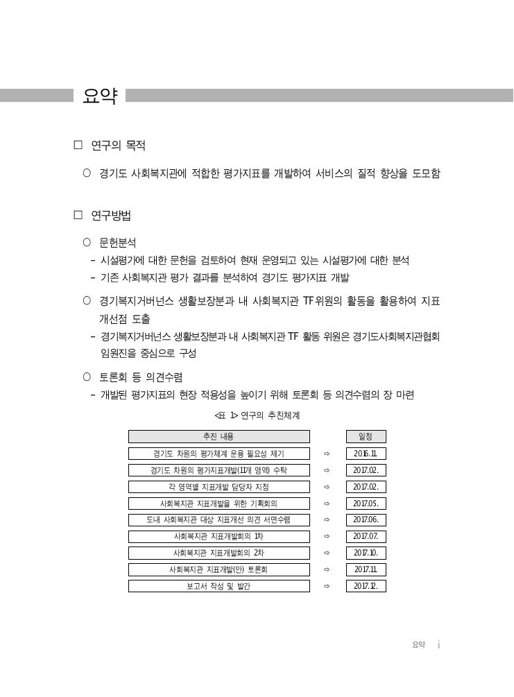 요약 i 요약 □ 연구의 목적 ○ 경기도 사회복지관에 적합한 평가지표를 개발하여 서비스의 질적 향상을 도모함 □ 연구방법 ○ 문헌분석 - 시설평가에 대한 문헌을 검토하여 현재 운영되고 있는 시설평가에 대한 분석 - 기존 사회복지관 평가 결과를 분석하여 경기도 평가지표 개발 ○ 경기복지거버넌스 생활보장분과 내 사회복지관 TF위원의 활동을 활용하여 지표 개선점 도출 - 경기복지거버넌스 생활보장분과 내 사회복지관 TF 활동 위원은 경기도사회복지관협회 임원진을 중심으로 구성 ○ 토론회 등 의견수렴 - 개발된 평가지표의 현장 적용성을 높이기 위해 토론회 등 의견수렴의 장 마련 <표 1> 연구의 추친체계 추진 내용 일정 경기도 차원의 평가체계 운용 필요성 제기 ⇨ 2016.11. 경기도 차원의 평가지표개발(11개 영역) 수탁 ⇨ 2017.02. 각 영역별 지표개발 담당자 지정 ⇨ 2017.02. 사회복지관 지표개발을 위한 기획회의 ⇨ 2017.05. 도내 사회복지관 대상 지표개선 의견 서면수렴 ⇨ 2017.06. 사회복지관 지표개발회의 1차 ⇨ 2017.07. 사회복지관 지표개발회의 2차 ⇨ 2017.10. 사회복지관 지표개발(안) 토론회 ⇨ 2017.11. 보고서 작성 및 발간 ⇨ 2017.12.