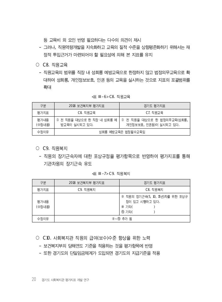 20 경기도 사회복지관 평가지표 개발 연구 등 교육비 외 요인 반영 필요하다는 다수의 의견이 제시 - 그러나, 직원역량개발을 지속화하고 교육의 질적 수준을 상향평준화하기 위해서는 재 정적 투입근거가 마련되어야 할 필요성에 의해 본 지표를 유지 ○ C8. 직원교육 - 직원교육의 범위를 직장 내 성희롱 예방교육으로 한정하지 않고 법정의무교육으로 확 대하여 성희롱, 개인정보보호, 인권 등의 교육을 실시하는 것으로 지표의 포괄범위를 확대 <표 Ⅲ-6> C8. 직원교육 구분 2018 보건복지부 평가지표 경기도 평가지표 평가지표 C8. 직원교육 C7. 직원교육 평가내용 (수정내용) ③ 전 직원을 대상으로 한 직장 내 성희롱 예 방교육이 실시되고 있다. ③ 전 직원을 대상으로 한 법정의무교육(성희롱, 개인정보보호, 인권등)이 실시되고 있다. 수정이유 성희롱 예방교육은 법정필수교육임 ○ C9. 직원복지 - 직원의 장기근속자에 대한 포상규정을 평가항목으로 반영하여 평가지표를 통해 기관차원의 장기근속 유도 <표 Ⅲ-7> C9. 직원복지 구분 2018 보건복지부 평가지표 경기도 평가지표 평가지표 C9. 직원복지 C8. 직원복지 평가내용 (수정내용) ⑨ 직원의 장기근속(5, 10, 15년)차를 위한 포상규 정이 있고 시행하고 있다. ⑩ 기타( ) ⑪ 기타( ) 수정이유 ⑨~⑪ 추가 됨 ○ C10. 사회복지관 직원의 급여(보수)수준 향상을 위한 노력 - 보건복지부의 당해연도 기준을 적용하는 것을 평가항목에 반영 - 또한 경기도의 단일임금체계가 도입되면 경기도의 지급기준을 적용