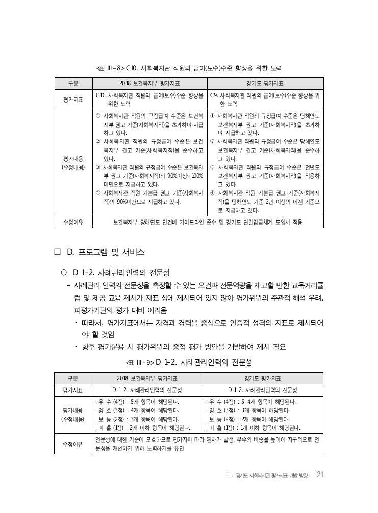 Ⅲ. 경기도 사회복지관 평가지표 개발 방향 21 <표 Ⅲ-8> C10. 사회복지관 직원의 급여(보수)수준 향상을 위한 노력 구분 2018 보건복지부 평가지표 경기도 평가지표 평가지표 C10. 사회복지관 직원의 급여(보수)수준 향상을 위한 노력 C9. 사회복지관 직원의 급여(보수)수준 향상을 위 한 노력 평가내용 (수정내용) ① 사회복지관 직원의 규정급여 수준은 보건복 지부 권고 기준(사회복지직)을 초과하여 지급 하고 있다. ② 사회복지관 직원의 규정급여 수준은 보건 복지부 권고 기준(사회복지직)을 준수하고 있다. ③ 사회복지관 직원의 규정급여 수준은 보건복지 부 권고 기준(사회복지직)의 90%이상~100% 미만으로 지급하고 있다. ④ 사회복지관 직원 기본급 권고 기준(사회복지 직)의 90%미만으로 지급하고 있다. ① 사회복지관 직원의 규정급여 수준은 당해연도 보건복지부 권고 기준(사회복지직)을 초과하 여 지급하고 있다. ② 사회복지관 직원의 규정급여 수준은 당해연도 보건복지부 권고 기준(사회복지직)을 준수하 고 있다. ③ 사회복지관 직원의 규정급여 수준은 전년도 보건복지부 권고 기준(사회복지직)을 적용하 고 있다. ④ 사회복지관 직원 기본급 권고 기준(사회복지 직)을 당해연도 기준 2년 이상의 이전 기준으 로 지급하고 있다. 수정이유 보건복지부 당해연도 인건비 가이드라인 준수 및 경기도 단일임금체계 도입시 적용 □ D. 프로그램 및 서비스 ○ D 1-2. 사례관리인력의 전문성 - 사례관리 인력의 전문성을 측정할 수 있는 요건과 전문역량을 제고할 만한 교육커리큘 럼 및 제공 교육 제시가 지표 상에 제시되어 있지 않아 평가위원의 주관적 해석 우려, 피평가기관의 평가 대비 어려움 ・ 따라서, 평가지표에서는 자격과 경력을 중심으로 인증적 성격의 지표로 제시되어 야 할 것임 ・ 향후 평가운용 시 평가위원의 중점 평가 방안을 개발하여 제시 필요 <표 Ⅲ-9> D 1-2. 사례관리인력의 전문성 구분 2018 보건복지부 평가지표 경기도 평가지표 평가지표 D 1-2. 사례관리인력의 전문성 D 1-2. 사례관리인력의 전문성 평가내용 (수정내용) ․ 우 수 (4점) : 5개 항목이 해당된다. ․ 양 호 (3점) : 4개 항목이 해당된다. ․ 보 통 (2점) : 3개 항목이 해당된다. ․ 미 흡 (1점) : 2개 이하 항목이 해당된다. ․ 우 수 (4점) : 5-4개 항목이 해당된다. ․ 양 호 (3점) : 3개 항목이 해당된다. ․ 보 통 (2점) : 2개 항목이 해당된다. ․ 미 흡 (1점) : 1개 이하 항목이 해당된다. 수정이유 전문성에 대한 기준이 모호하므로 평가자에 따라 편차가 발생. 우수의 비중을 높이어 자구적으로 전문성을 개선하기 위해 노력하기를 유인