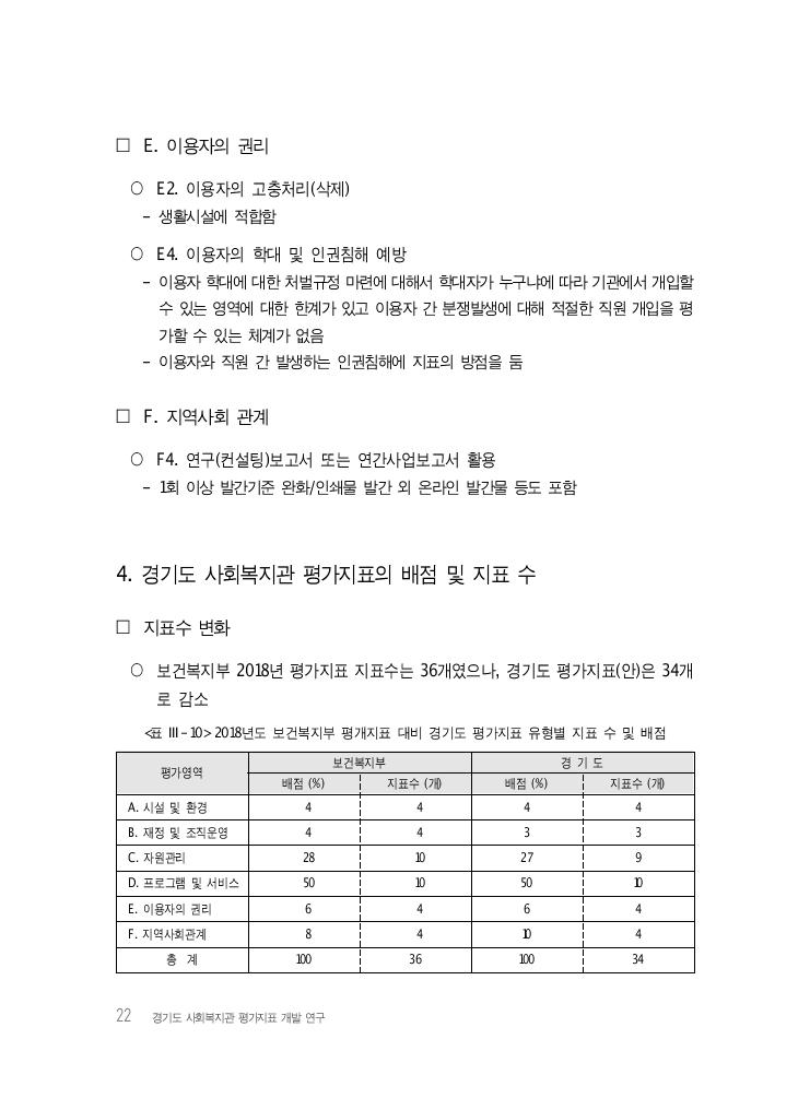 22 경기도 사회복지관 평가지표 개발 연구 □ E. 이용자의 권리 ○ E2. 이용자의 고충처리(삭제) - 생활시설에 적합함 ○ E4. 이용자의 학대 및 인권침해 예방 - 이용자 학대에 대한 처벌규정 마련에 대해서 학대자가 누구냐에 따라 기관에서 개입할 수 있는 영역에 대한 한계가 있고 이용자 간 분쟁발생에 대해 적절한 직원 개입을 평 가할 수 있는 체계가 없음 - 이용자와 직원 간 발생하는 인권침해에 지표의 방점을 둠 □ F. 지역사회 관계 ○ F4. 연구(컨설팅)보고서 또는 연간사업보고서 활용 - 1회 이상 발간기준 완화/인쇄물 발간 외 온라인 발간물 등도 포함 4. 경기도 사회복지관 평가지표의 배점 및 지표 수 □ 지표수 변화 ○ 보건복지부 2018년 평가지표 지표수는 36개였으나, 경기도 평가지표(안)은 34개 로 감소 <표 Ⅲ-10> 2018년도 보건복지부 평개지표 대비 경기도 평가지표 유형별 지표 수 및 배점 평가영역 보건복지부 경 기 도 배점 (%) 지표수 (개) 배점 (%) 지표수 (개) A. 시설 및 환경 4 4 4 4 B. 재정 및 조직운영 4 4 3 3 C. 자원관리 28 10 27 9 D. 프로그램 및 서비스 50 10 50 10 E. 이용자의 권리 6 4 6 4 F. 지역사회관계 8 4 10 4 총 계 100 36 100 34