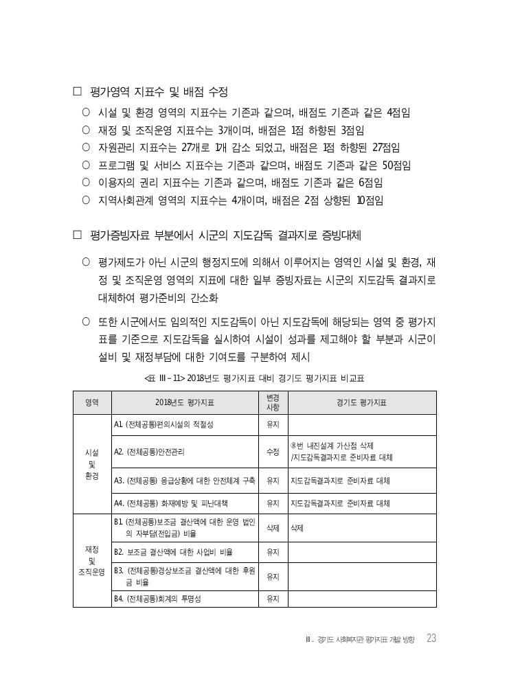 Ⅲ. 경기도 사회복지관 평가지표 개발 방향 23 영역 2018년도 평가지표 변경사항 경기도 평가지표 시설 및 환경 A1. (전체공통)편의시설의 적절성 유지 A2. (전체공통)안전관리 수정 ⑧번 내진설계 가산점 삭제/지도감독결과지로 준비자료 대체 A3. (전체공통) 응급상황에 대한 안전체계 구축 유지 지도감독결과지로 준비자료 대체 A4. (전체공통) 화재예방 및 피난대책 유지 지도감독결과지로 준비자료 대체 재정 및 조직운영 B1. (전체공통)보조금 결산액에 대한 운영 법인 의 자부담(전입금) 비율 삭제 삭제 B2. 보조금 결산액에 대한 사업비 비율 유지 B3. (전체공통)경상보조금 결산액에 대한 후원 금 비율 유지 B4. (전체공통)회계의 투명성 유지 □ 평가영역 지표수 및 배점 수정 ○ 시설 및 환경 영역의 지표수는 기존과 같으며, 배점도 기존과 같은 4점임 ○ 재정 및 조직운영 지표수는 3개이며, 배점은 1점 하향된 3점임 ○ 자원관리 지표수는 27개로 1개 감소 되었고, 배점은 1점 하향된 27점임 ○ 프로그램 및 서비스 지표수는 기존과 같으며, 배점도 기존과 같은 50점임 ○ 이용자의 권리 지표수는 기존과 같으며, 배점도 기존과 같은 6점임 ○ 지역사회관계 영역의 지표수는 4개이며, 배점은 2점 상향된 10점임 □ 평가증빙자료 부분에서 시군의 지도감독 결과지로 증빙대체 ○ 평가제도가 아닌 시군의 행정지도에 의해서 이루어지는 영역인 시설 및 환경, 재 정 및 조직운영 영역의 지표에 대한 일부 증빙자료는 시군의 지도감독 결과지로 대체하여 평가준비의 간소화 ○ 또한 시군에서도 임의적인 지도감독이 아닌 지도감독에 해당되는 영역 중 평가지 표를 기준으로 지도감독을 실시하여 시설이 성과를 제고해야 할 부분과 시군이 설비 및 재정부담에 대한 기여도를 구분하여 제시 <표 Ⅲ-11> 2018년도 평가지표 대비 경기도 평가지표 비교표