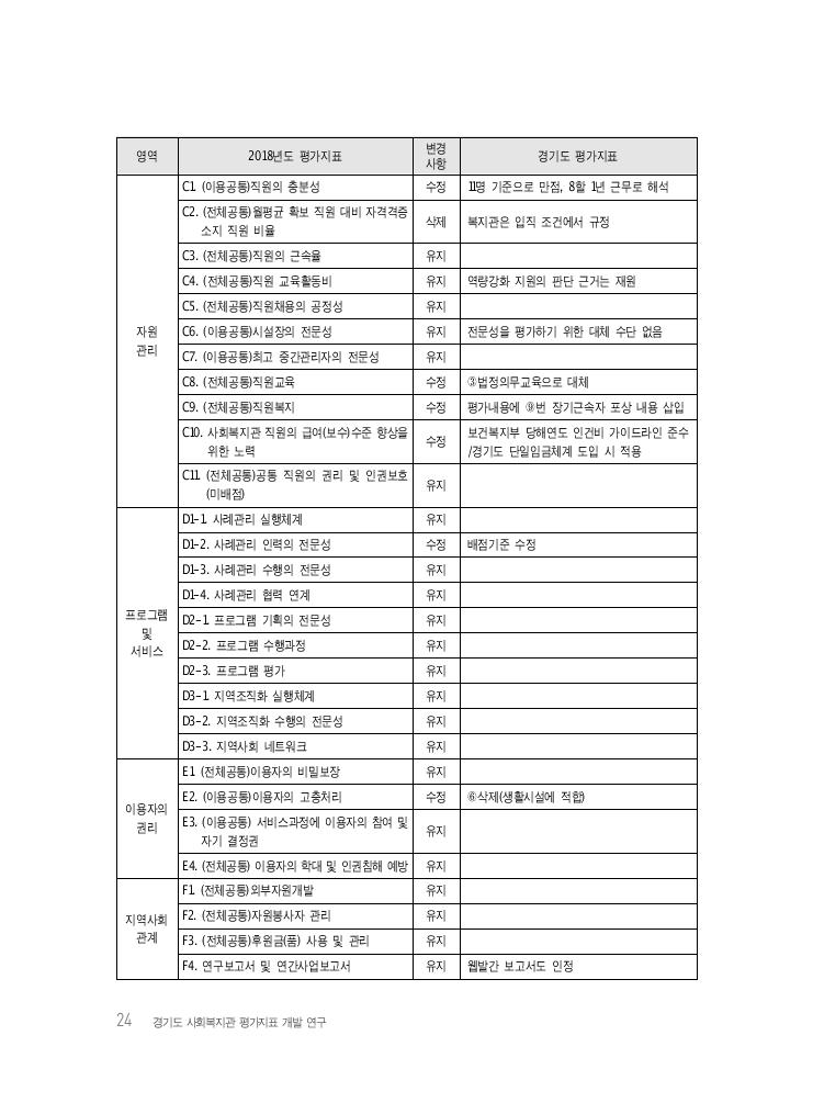 24 경기도 사회복지관 평가지표 개발 연구 영역 2018년도 평가지표 변경사항 경기도 평가지표 자원 관리 C1. (이용공통)직원의 충분성 수정 11명 기준으로 만점, 8할 1년 근무로 해석 C2. (전체공통)월평균 확보 직원 대비 자격격증 소지 직원 비율 삭제 복지관은 입직 조건에서 규정 C3. (전체공통)직원의 근속율 유지 C4. (전체공통)직원 교육활동비 유지 역량강화 지원의 판단 근거는 재원 C5. (전체공통)직원채용의 공정성 유지 C6. (이용공통)시설장의 전문성 유지 전문성을 평가하기 위한 대체 수단 없음 C7. (이용공통)최고 중간관리자의 전문성 유지 C8. (전체공통)직원교육 수정 ③법정의무교육으로 대체 C9. (전체공통)직원복지 수정 평가내용에 ⑨번 장기근속자 포상 내용 삽입 C10. 사회복지관 직원의 급여(보수)수준 향상을 위한 노력 수정 보건복지부 당해연도 인건비 가이드라인 준수 /경기도 단일임금체계 도입 시 적용 C11. (전체공통)공통 직원의 권리 및 인권보호 (미배점) 유지 프로그램 및 서비스 D1-1. 사례관리 실행체계 유지 D1-2. 사례관리 인력의 전문성 수정 배점기준 수정 D1-3. 사례관리 수행의 전문성 유지 D1-4. 사례관리 협력 연계 유지 D2-1. 프로그램 기획의 전문성 유지 D2-2. 프로그램 수행과정 유지 D2-3. 프로그램 평가 유지 D3-1. 지역조직화 실행체계 유지 D3-2. 지역조직화 수행의 전문성 유지 D3-3. 지역사회 네트워크 유지 이용자의 권리 E1. (전체공통)이용자의 비밀보장 유지 E2. (이용공통)이용자의 고충처리 수정 ⑥삭제(생활시설에 적합) E3. (이용공통) 서비스과정에 이용자의 참여 및 자기 결정권 유지 E4. (전체공통) 이용자의 학대 및 인권침해 예방 유지 지역사회 관계 F1. (전체공통)외부자원개발 유지 F2. (전체공통)자원봉사자 관리 유지 F3. (전체공통)후원금(품) 사용 및 관리 유지 F4. 연구보고서 및 연간사업보고서 유지 웹발간 보고서도 인정