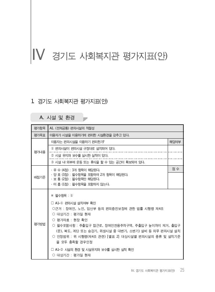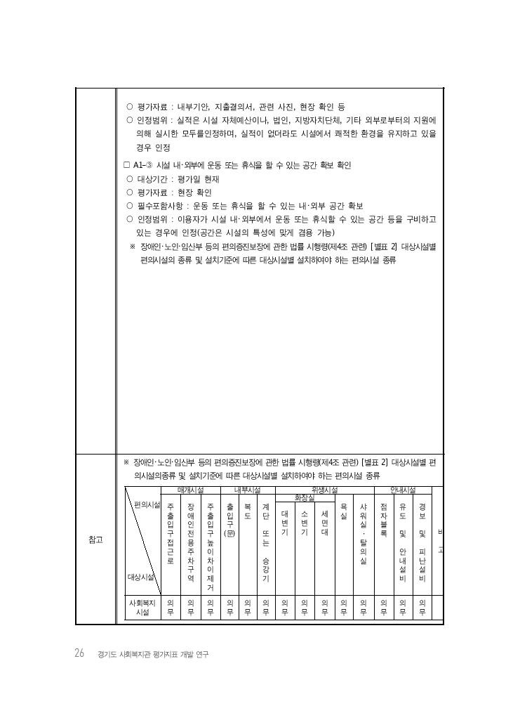Ⅳ. 경기도 사회복지관 평가지표(안) 25 Ⅳ 경기도 사회복지관 평가지표(안) 평가항목 A1. (전체공통) 편의시설의 적절성 평가목표 이용자가 시설을 이용하기에 편리한 시설환경을 갖추고 있다. 평가내용 이용자는 편의시설을 이용하기 편리한가? 해당여부 ① 편의시설이 편의시설 규정대로 설치되어 있다. ② 시설 유지와 보수를 실시한 실적이 있다. ③ 시설 내・외부에 운동 또는 휴식을 할 수 있는 공간이 확보되어 있다. 배점기준 · 우 수 (4점) : 3개 항목이 해당된다. · 양 호 (3점) : 필수항목을 포함하여 2개 항목이 해당된다. · 보 통 (2점) : 필수항목만 해당된다. · 미 흡 (1점) : 필수항목을 포함하지 않는다. 점 수 평가방법 ※ 필수항목 : ① □ A1-① 편의시설 설치여부 확인 ○근거 : 장애인, 노인, 임산부 등의 편의증진보장에 관한 법률 시행령 제4조 ○ 대상기간 : 평가일 현재 ○ 평가자료 : 현장 확인 ○ 필수포함사항 : 주출입구 접근로, 장애인전용주차구역, 주출입구 높이차이 제거, 출입구 (문), 복도, 계단 또는 승강기, 위생시설 중 대변기, 소변기) 설비 등 의무 편의시설 설치 ○ 인정범위 : 위 시행령(제4조 관련) [별표 2] 대상시설별 편의시설의 종류 및 설치기준 을 모두 충족할 경우인정 □ A1-② 시설의 환경 및 시설유지와 보수룰 실시한 실적 확인 ○ 대상기간 : 평가일 현재 1. 경기도 사회복지관 평가지표(안) A. 시설 및 환경