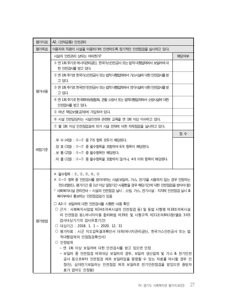 Ⅳ. 경기도 사회복지관 평가지표(안) 27 평가지표 A2. (전체공통) 안전관리 평가목표 이용자와 직원이 시설을 이용하기에 안전하도록 정기적인 안전점검을 실시하고 있다. 평가내용 시설의 안전관리 상태는 어떠한가? 해당여부 ① 연 1회 주기로 에너지관리공단, 한국가스안전공사 또는 법적 대행업체에서 보일러에 대 한 안전검사를 받고 있다. ② 연 1회 주기로 한국가스안전공사 또는 법적 대행업체에서 가스시설에 대한 안전검사를 받 고 있다. ③ 연 1회 주기로 한국전기안전공사 또는 법적 대행업체에서 전기시설에 대한 안전검사를 받 고 있다. ④ 연 1회 주기로 한국화재보험협회, 관할 소방서 또는 법적대행업체에서 소방시설에 대한 안전검사를 받고 있다. ⑤ 매년 책임보험(공제)에 가입되어 있다. ⑥ 시설 안전담당자는 시설안전과 관련된 교육을 연 1회 이상 이수하고 있다. ⑦ 월 1회 이상 안전점검표에 의거 시설 전체에 대한 자체점검을 실시하고 있다. 배점기준 ․ 우 수 (4점) : ①~⑦ 중 7개 항목 모두가 해당된다. ․ 양 호 (3점) : ①~⑦ 중 필수항목을 포함하여 6개 항목이 해당된다. ․ 보 통 (2점) : ①~⑦ 중 필수항목만 해당된다. ․ 미 흡 (1점) : ①~⑦ 중 필수항목을 포함하지 않거나, 4개 이하 항목이 해당된다. 점 수 평가방법 ※ 필수항목 : ①, ②, ③, ④, ⑤ ※ ①~③ 항목 중 안전검사를 받아야하는 시설(보일러, 가스, 전기)을 사용하지 않는 경우 인정하는 것으로함(단, 평가기간 중 1년 이상 일정기간 사용했을 경우 해당기간에 대한 안전점검을 받아야 함) * 사회복지시설 관리안내 - 시설의 안전점검 실시 : 소방, 가스, 전기시설 : 지자체 안전점검 실시 & 복지부에서 통보하는 안전점검표가 있음 □ A2-① 보일러에 대한 안전검사를 시행한 내용 확인 ○ 근거 : 사회복지사업법 제34조의4(시설의 안전점검 등) 및 동법 시행령 제18조의4(시설 의 안전점검 등),에너지이용 합리화법 제39조 및 시행규칙 제31조의8제1항(별표 3의5 검사대상기기의 검사유효기간) ○ 대상기간 : 2018. 1. 1 ~ 2020. 12. 31 ○ 평가자료 : 시군 지도감독결과확인서 대체(에너지관리공단, 한국가스안전공사 또는 법 적대행업체의 안점점검확인서) ○ 인정범위 - 연 1회 이상 보일러에 대한 안전검사를 받고 있으면 인정 - 보일러 중 안전점검 제외대상 보일러의 경우, 보일러 생산업체 및 가스 & 전기안전 공사 등으로부터 안전점검 예외 보일러임을 증명할 수 있는 자료를 제시할 경우 인 정(단, 심야전기보일러는 안전점검 예외 보일러로 전기안전점검을 받았으면 증빙자 료가 없어도 인정됨)