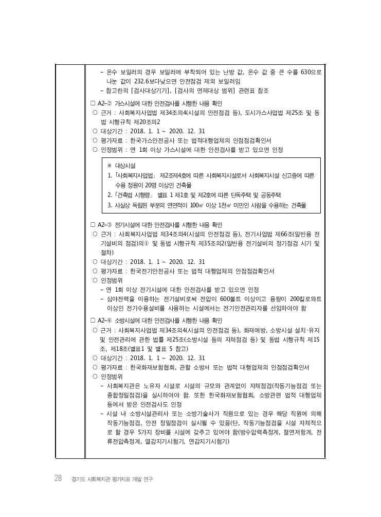 28 경기도 사회복지관 평가지표 개발 연구 - 온수 보일러의 경우 보일러에 부착되어 있는 난방 값, 온수 값 중 큰 수를 630으로 나눈 값이 232.6보다낮으면 안전점검 제외 보일러임 - 참고란의 [검사대상기기], [검사의 면제대상 범위] 관련표 참조 □ A2-② 가스시설에 대한 안전검사를 시행한 내용 확인 ○ 근거 : 사회복지사업법 제34조의4(시설의 안전점검 등), 도시가스사업법 제25조 및 동 법 시행규칙 제20조의2 ○ 대상기간 : 2018. 1. 1 ~ 2020. 12. 31 ○ 평가자료 : 한국가스안전공사 또는 법적대행업체의 안점점검확인서 ○ 인정범위 : 연 1회 이상 가스시설에 대한 안전검사를 받고 있으면 인정 ※ 대상시설 1. 「사회복지사업법」 제2조제4호에 따른 사회복지시설로서 사회복지시설 신고증에 따른 수용 정원이 20명 이상인 건축물 2. 「건축법 시행령」 별표 1 제1호 및 제2호에 따른 단독주택 및 공동주택 3. 사실상 독립된 부분의 연면적이 100㎡ 이상 1천㎡ 미만인 사람을 수용하는 건축물 □ A2-③ 전기시설에 대한 안전검사를 시행한 내용 확인 ○ 근거 : 사회복지사업법 제34조의4(시설의 안전점검 등), 전기사업법 제66조(일반용 전 기설비의 점검)의① 및 동법 시행규칙 제35조의2(일반용 전기설비의 정기점검 시기 및 절차) ○ 대상기간 : 2018. 1. 1 ~ 2020. 12. 31 ○ 평가자료 : 한국전기안전공사 또는 법적 대행업체의 안점점검확인서 ○ 인정범위 - 연 1회 이상 전기시설에 대한 안전검사를 받고 있으면 인정 - 심야전력을 이용하는 전기설비로써 전압이 600볼트 이상이고 용량이 200킬로와트 이상인 전기수용설비를 사용하는 시설에서는 전기안전관리자를 선임하여야 함 □ A2-④ 소방시설에 대한 안전검사를 시행한 내용 확인 ○ 근거 : 사회복지사업법 제34조의4(시설의 안전점검 등), 화재예방, 소방시설 설치・유지 및 안전관리에 관한 법률 제25조(소방시설 등의 자체점검 등) 및 동법 시행규칙 제15 조, 제18조(별표1 및 별표 5 참고) ○ 대상기간 : 2018. 1. 1 ~ 2020. 12. 31 ○ 평가자료 : 한국화재보험협회, 관할 소방서 또는 법적 대행업체의 안점점검확인서 ○ 인정범위 - 사회복지관은 노유자 시설로 시설의 규모와 관계없이 자체점검(작동기능점검 또는 종합정밀점검)을 실시하여야 함. 또한 한국화재보험협회, 소방관련 법적 대행업체 등에서 받은 안전검사도 인정 - 시설 내 소방시설관리사 또는 소방기술사가 직원으로 있는 경우 해당 직원에 의해 작동기능점검, 안전 정밀점검이 실시될 수 있음(단, 작동기능점검을 시설 자체적으 로 할 경우 5가지 장비를 시설에 갖추고 있어야 함(방수압력측정계, 절연저항계, 전 류전압측정계, 열감지기시험기, 연감지기시험기)