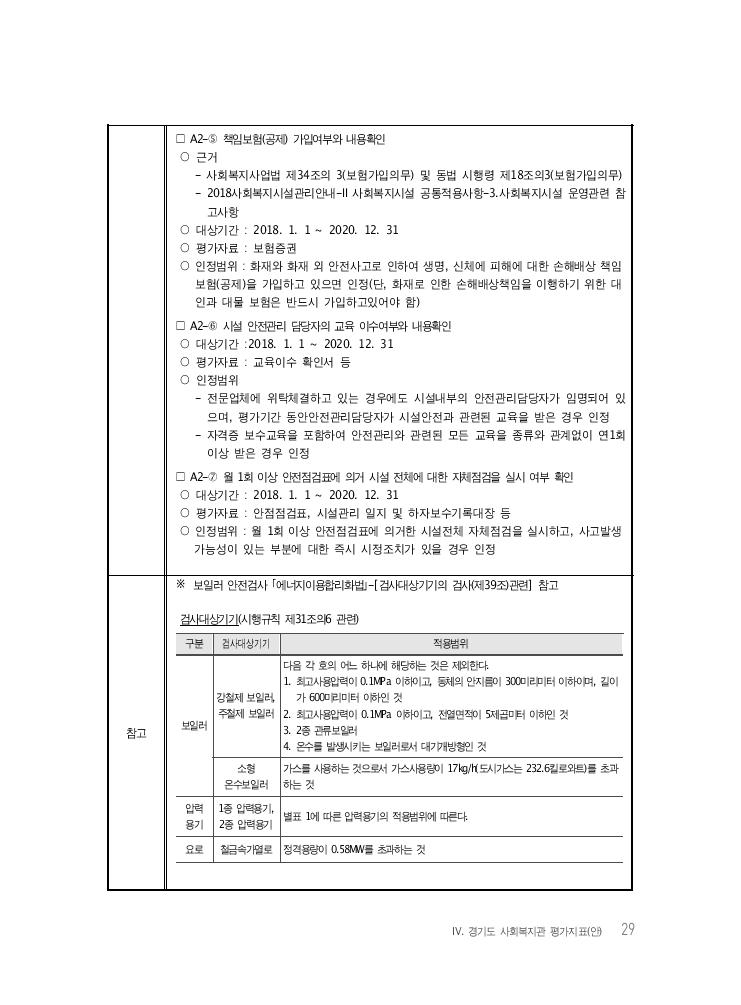 Ⅳ. 경기도 사회복지관 평가지표(안) 29 □ A2-⑤ 책임보험(공제) 가입여부와 내용확인 ○ 근거 - 사회복지사업법 제34조의 3(보험가입의무) 및 동법 시행령 제18조의3(보험가입의무) - 2018사회복지시설관리안내-Ⅱ사회복지시설 공통적용사항-3.사회복지시설 운영관련 참 고사항 ○ 대상기간 : 2018. 1. 1 ~ 2020. 12. 31 ○ 평가자료 : 보험증권 ○ 인정범위 : 화재와 화재 외 안전사고로 인하여 생명, 신체에 피해에 대한 손해배상 책임 보험(공제)을 가입하고 있으면 인정(단, 화재로 인한 손해배상책임을 이행하기 위한 대 인과 대물 보험은 반드시 가입하고있어야 함) □ A2-⑥ 시설 안전관리 담당자의 교육 이수여부와 내용확인 ○ 대상기간 :2018. 1. 1 ~ 2020. 12. 31 ○ 평가자료 : 교육이수 확인서 등 ○ 인정범위 - 전문업체에 위탁체결하고 있는 경우에도 시설내부의 안전관리담당자가 임명되어 있 으며, 평가기간 동안안전관리담당자가 시설안전과 관련된 교육을 받은 경우 인정 - 자격증 보수교육을 포함하여 안전관리와 관련된 모든 교육을 종류와 관계없이 연1회 이상 받은 경우 인정 □ A2-⑦ 월 1회 이상 안전점검표에 의거 시설 전체에 대한 자체점검을 실시 여부 확인 ○ 대상기간 : 2018. 1. 1 ~ 2020. 12. 31 ○ 평가자료 : 안점점검표, 시설관리 일지 및 하자보수기록대장 등 ○ 인정범위 : 월 1회 이상 안전점검표에 의거한 시설전체 자체점검을 실시하고, 사고발생 가능성이 있는 부분에 대한 즉시 시정조치가 있을 경우 인정 참고 검사대상기기(시행규칙 제31조의6 관련) 구분 검사대상기기 적용범위 보일러 강철제 보일러, 주철제 보일러 다음 각 호의 어느 하나에 해당하는 것은 제외한다. 1. 최고사용압력이 0.1MPa 이하이고, 동체의 안지름이 300미리미터 이하이며, 길이 가 600미리미터 이하인 것 2. 최고사용압력이 0.1MPa 이하이고, 전열면적이 5제곱미터 이하인 것 3. 2종 관류보일러 4. 온수를 발생시키는 보일러로서 대기개방형인 것 소형 온수보일러 가스를 사용하는 것으로서 가스사용량이 17kg/h(도시가스는 232.6킬로와트)를 초과 하는 것 압력 용기 1종 압력용기, 2종 압력용기 별표 1에 따른 압력용기의 적용범위에 따른다. 요로 철금속가열로 정격용량이 0.58MW를 초과하는 것 ※ 보일러 안전검사 「에너지이용합리화법」-[검사대상기기의 검사(제39조)관련] 참고