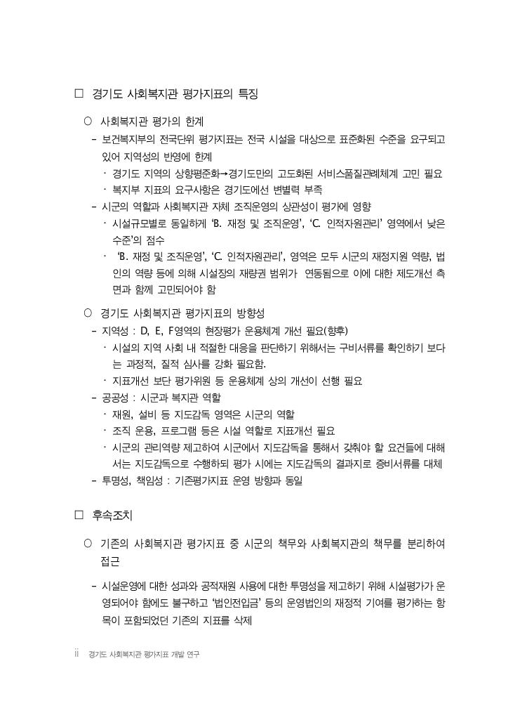 ii 경기도 사회복지관 평가지표 개발 연구 □ 경기도 사회복지관 평가지표의 특징 ○ 사회복지관 평가의 한계 - 보건복지부의 전국단위 평가지표는 전국 시설을 대상으로 표준화된 수준을 요구되고 있어 지역성의 반영에 한계 ・ 경기도 지역의 상향평준화→경기도만의 고도화된 서비스품질관례체계 고민 필요 ・ 복지부 지표의 요구사항은 경기도에선 변별력 부족 - 시군의 역할과 사회복지관 자체 조직운영의 상관성이 평가에 영향 ・ 시설규모별로 동일하게 ‘B. 재정 및 조직운영’, ‘C. 인적자원관리’ 영역에서 낮은 수준’의 점수 ・ ‘B. 재정 및 조직운영’, ‘C. 인적자원관리’, 영역은 모두 시군의 재정지원 역량, 법 인의 역량 등에 의해 시설장의 재량권 범위가 연동됨으로 이에 대한 제도개선 측 면과 함께 고민되어야 함 ○ 경기도 사회복지관 평가지표의 방향성 - 지역성 : D, E, F영역의 현장평가 운용체계 개선 필요(향후) ・ 시설의 지역 사회 내 적절한 대응을 판단하기 위해서는 구비서류를 확인하기 보다 는 과정적, 질적 심사를 강화 필요함. ・ 지표개선 보단 평가위원 등 운용체계 상의 개선이 선행 필요 - 공공성 : 시군과 복지관 역할 ・ 재원, 설비 등 지도감독 영역은 시군의 역할 ・ 조직 운용, 프로그램 등은 시설 역할로 지표개선 필요 ・ 시군의 관리역량 제고하여 시군에서 지도감독을 통해서 갖춰야 할 요건들에 대해 서는 지도감독으로 수행하되 평가 시에는 지도감독의 결과지로 증비서류를 대체 - 투명성, 책임성 : 기존평가지표 운영 방향과 동일 □ 후속조치 ○ 기존의 사회복지관 평가지표 중 시군의 책무와 사회복지관의 책무를 분리하여 접근 - 시설운영에 대한 성과와 공적재원 사용에 대한 투명성을 제고하기 위해 시설평가가 운 영되어야 함에도 불구하고 ‘법인전입금’ 등의 운영법인의 재정적 기여를 평가하는 항 목이 포함되었던 기존의 지표를 삭제