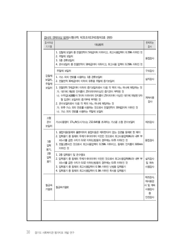 30 경기도 사회복지관 평가지표 개발 연구 검사의 면제대상 범위(시행규칙 제31조의13제1항제1호 관련) 검사대상 기기명 대상범위 면제되는 검사 강철제 보일러, 주철제 보일러 1. 강철제 보일러 중 전열면적이 5제곱미터 이하이고, 최고사용압력이 0.35㎫ 이하인 것 2. 주철제 보일러 3. 1종 관류보일러 4. 온수보일러 중 전열면적이 18제곱미터 이하이고, 최고사용 압력이 0.35㎫ 이하인 것 용접검사 주철제 보일러 구조검사 1. 가스 외의 연료를 사용하는 1종 관류보일러 2. 전열면적 30제곱미터 이하의 유류용 주철제 증기보일러 설치검사 1. 전열면적 5제곱미터 이하의 증기보일러로서 다음 각 목의 어느 하나에 해당하는 것 가. 대기에 개방된 안지름이 25미리미터이상인 증기관이 부착된 것 나. 수두압(水頭壓)이 5미터 이하이며 안지름이 25미리미터 이상인 대기에 개방된 U자 형 입관이 보일러의 증기부에 부착된 것 2. 온수보일러로서 다음 각 목의 어느 하나에 해당하는 것 가. 유류・가스 외의 연료를 사용하는 것으로서 전열면적이 30제곱미터 이하인 것 나. 가스 외의 연료를 사용하는 주철제 보일러 계속사용 검사 소형 온수 보일러 가스사용량이 17㎏/h(도시가스는 232.6㎾)를 초과하는 가스용 소형 온수보일러 제조검사 1종 압력 용기, 2종 압력 용기 1. 용접이음(동체와 플랜지와의 용접이음은 제외한다)이 없는 강관을 동체로 한 헤더 2. 압력용기 중 동체의 두께가 6미리미터 미만인 것으로서 최고사용압력(㎫)과 내부 부 피(㎥)를 곱한 수치가 0.02 이하(난방용의 경우에는 0.05 이하)인 것 3. 전열교환식인 것으로서 최고사용압력이 0.35㎫ 이하이고, 동체의 안지름이 600mm 이하인 것 용접검사 1. 2종 압력용기 및 온수탱크 2. 압력용기 중 동체의 두께가 6미리미터 미만인 것으로서 최고사용압력(㎫)과 내부 부 피(㎥)를 곱한 수치가 0.02 이하(난방용의 경우에는 0.05 이하)인 것 3. 압력용기 중 동체의 최고사용압력이 0.5㎫ 이하인 난방용 압력용기 4. 압력용기 중 동체의 최고사용압력이 0.1㎫ 이하인 취사용 압력용기 설치검사 및 계속 사용검사 철금속 가열로 철금속가열로 제조검사, 재사용검 사 및 계속 사용검사 중 안전검사