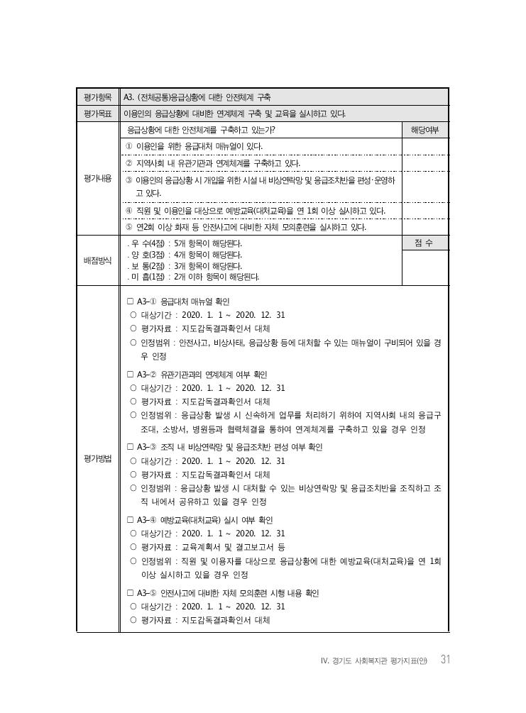 Ⅳ. 경기도 사회복지관 평가지표(안) 31 평가항목 A3. (전체공통)응급상황에 대한 안전체계 구축 평가목표 이용인의 응급상황에 대비한 연계체계 구축 및 교육을 실시하고 있다. 평가내용 응급상황에 대한 안전체계를 구축하고 있는가? 해당여부 ① 이용인을 위한 응급대처 매뉴얼이 있다. ② 지역사회 내 유관기관과 연계체계를 구축하고 있다. ③ 이용인의 응급상황 시 개입을 위한 시설 내 비상연락망 및 응급조치반을 편성・운영하 고 있다. ④ 직원 및 이용인을 대상으로 예방교육(대처교육)을 연 1회 이상 실시하고 있다. ⑤ 연2회 이상 화재 등 안전사고에 대비한 자체 모의훈련을 실시하고 있다. 배점방식 ․ 우 수(4점) : 5개 항목이 해당된다. ․ 양 호(3점) : 4개 항목이 해당된다. ․ 보 통(2점) : 3개 항목이 해당된다. ․ 미 흡(1점) : 2개 이하 항목이 해당된다. 점 수 평가방법 □ A3-① 응급대처 매뉴얼 확인 ○ 대상기간 : 2020. 1. 1 ~ 2020. 12. 31 ○ 평가자료 : 지도감독결과확인서 대체 ○ 인정범위 : 안전사고, 비상사태, 응급상황 등에 대처할 수 있는 매뉴얼이 구비되어 있을 경 우 인정 □ A3-② 유관기관과의 연계체계 여부 확인 ○ 대상기간 : 2020. 1. 1 ~ 2020. 12. 31 ○ 평가자료 : 지도감독결과확인서 대체 ○ 인정범위 : 응급상황 발생 시 신속하게 업무를 처리하기 위하여 지역사회 내의 응급구 조대, 소방서, 병원등과 협력체결을 통하여 연계체계를 구축하고 있을 경우 인정 □ A3-③ 조직 내 비상연락망 및 응급조치반 편성 여부 확인 ○ 대상기간 : 2020. 1. 1 ~ 2020. 12. 31 ○ 평가자료 : 지도감독결과확인서 대체 ○ 인정범위 : 응급상황 발생 시 대처할 수 있는 비상연락망 및 응급조치반을 조직하고 조 직 내에서 공유하고 있을 경우 인정 □ A3-④ 예방교육(대처교육) 실시 여부 확인 ○ 대상기간 : 2020. 1. 1 ~ 2020. 12. 31 ○ 평가자료 : 교육계획서 및 결고보고서 등 ○ 인정범위 : 직원 및 이용자를 대상으로 응급상황에 대한 예방교육(대처교육)을 연 1회 이상 실시하고 있을 경우 인정 □ A3-⑤ 안전사고에 대비한 자체 모의훈련 시행 내용 확인 ○ 대상기간 : 2020. 1. 1 ~ 2020. 12. 31 ○ 평가자료 : 지도감독결과확인서 대체