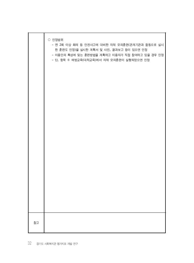 32 경기도 사회복지관 평가지표 개발 연구 ○ 인정범위 - 연 2회 이상 화재 등 안전사고에 대비한 자체 모의훈련(관계기관과 합동으로 실시 한 훈련도 인정)을 실시한 계획서 및 사진, 결과보고 등이 있으면 인정 - 이용인의 특성에 맞는 훈련방법을 계획하고 이용자가 직접 참여하고 있을 경우 인정 - 단, 항목 ④ 예방교육(대처교육)에서 자체 모의훈련이 실행되었으면 인정 참고