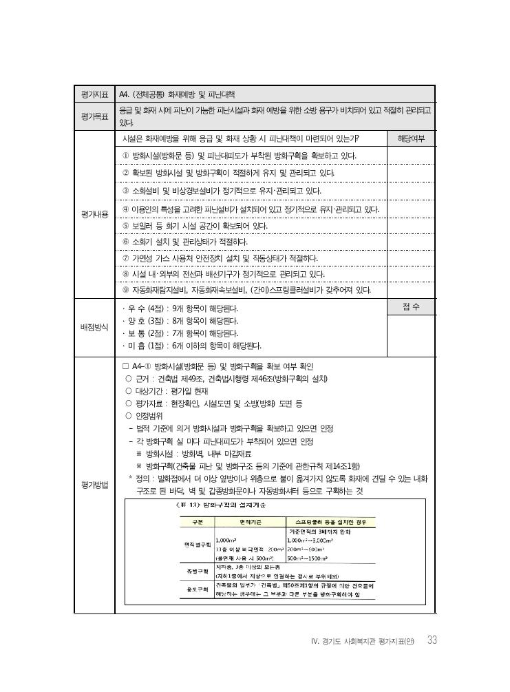 Ⅳ. 경기도 사회복지관 평가지표(안) 33 평가지표 A4. (전체공통) 화재예방 및 피난대책 평가목표 응급 및 화재 시에 피난이 가능한 피난시설과 화재 예방을 위한 소방 용구가 비치되어 있고 적절히 관리되고 있다. 평가내용 시설은 화재예방을 위해 응급 및 화재 상황 시 피난대책이 마련되어 있는가? 해당여부 ① 방화시설(방화문 등) 및 피난대피도가 부착된 방화구획을 확보하고 있다. ② 확보된 방화시설 및 방화구획이 적절하게 유지 및 관리되고 있다. ③ 소화설비 및 비상경보설비가 정기적으로 유지・관리되고 있다. ④ 이용인의 특성을 고려한 피난설비가 설치되어 있고 정기적으로 유지・관리되고 있다. ⑤ 보일러 등 화기 시설 공간이 확보되어 있다. ⑥ 소화기 설치 및 관리상태가 적절하다. ⑦ 가연성 가스 사용처 안전장치 설치 및 작동상태가 적절하다. ⑧ 시설 내・외부의 전선과 배선기구가 정기적으로 관리되고 있다. ⑨ 자동화재탐지설비, 자동화재속보설비, (간이)스프링클러설비가 갖추어져 있다. 배점방식 · 우 수 (4점) : 9개 항목이 해당된다. · 양 호 (3점) : 8개 항목이 해당된다. · 보 통 (2점) : 7개 항목이 해당된다. · 미 흡 (1점) : 6개 이하의 항목이 해당된다. 점 수 평가방법 □ A4-① 방화시설(방화문 등) 및 방화구획을 확보 여부 확인 ○ 근거 : 건축법 제49조, 건축법시행령 제46조(방화구획의 설치) ○ 대상기간 : 평가일 현재 ○ 평가자료 : 현장확인, 시설도면 및 소방(방화) 도면 등 ○ 인정범위 - 법적 기준에 의거 방화시설과 방화구획을 확보하고 있으면 인정 - 각 방화구획 실 마다 피난대피도가 부착되어 있으면 인정 ※ 방화시설 : 방화벽, 내부 마감재료 ※ 방화구획(건축물 피난 및 방화구조 등의 기준에 관한규칙 제14조1항) * 정의 : 발화점에서 더 이상 옆방이나 위층으로 불이 옮겨가지 않도록 화재에 견딜 수 있는 내화 구조로 된 바닥, 벽 및 갑종방화문이나 자동방화셔터 등으로 구획하는 것